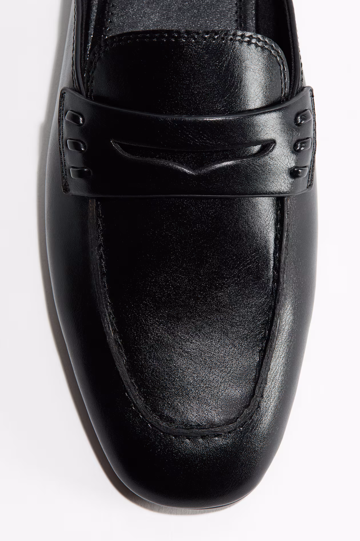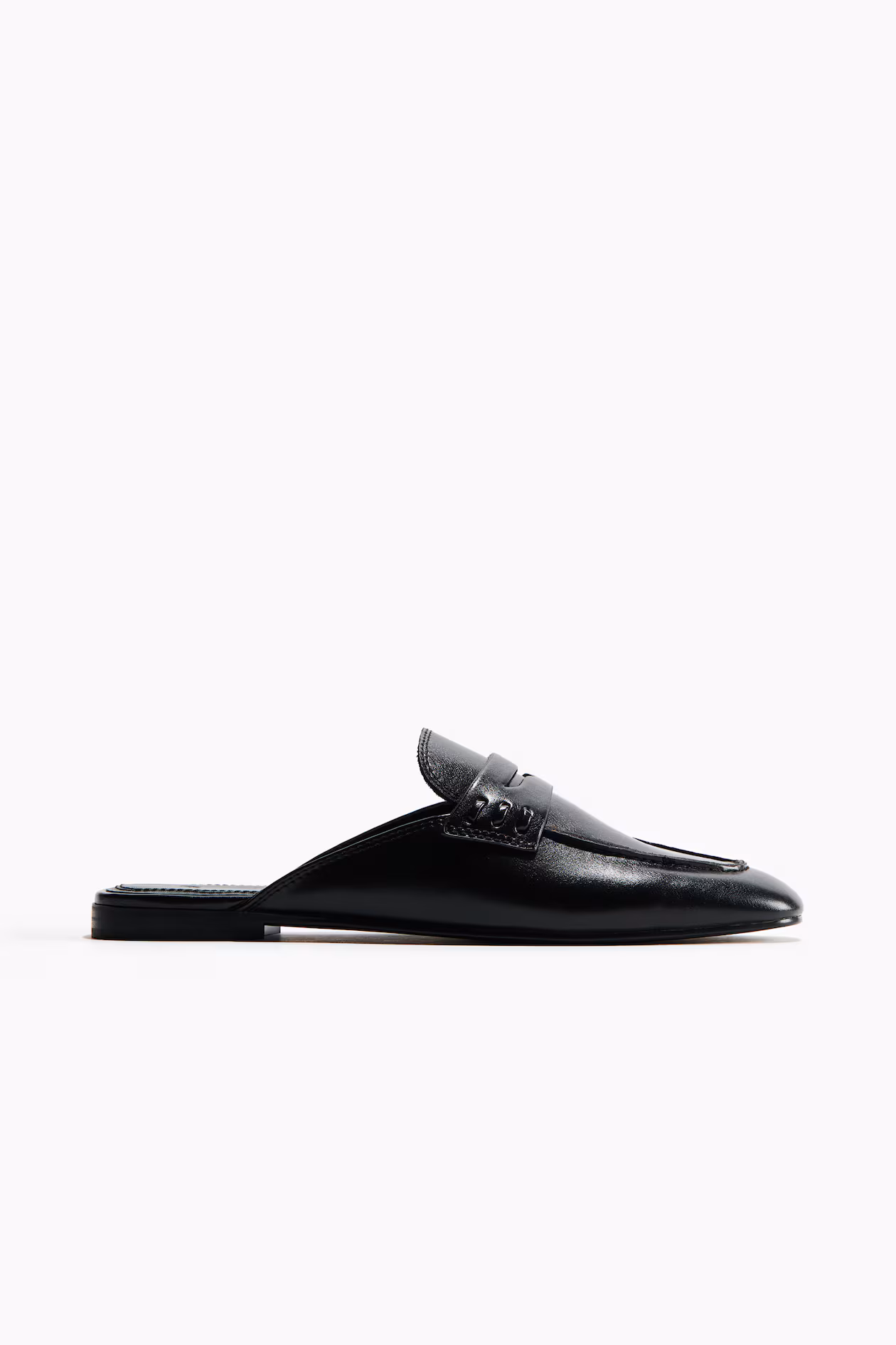 Loafer mules with almond toes, a moccasin seam at front, and a penny keeper at top. Jersey lining.