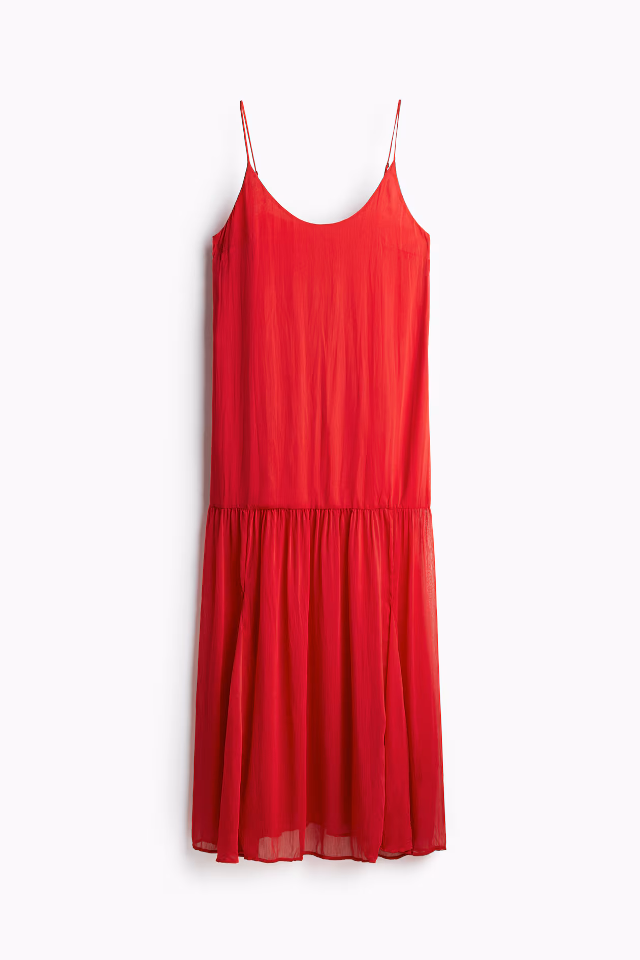 Long dress in sheer chiffon with a gently flared skirt. Adjustable, extra-narrow shoulder straps, scoop neck at front, and a concealed zipper at back. Gathered seam above knees and godet pleats at front and back of skirt. Partly lined.