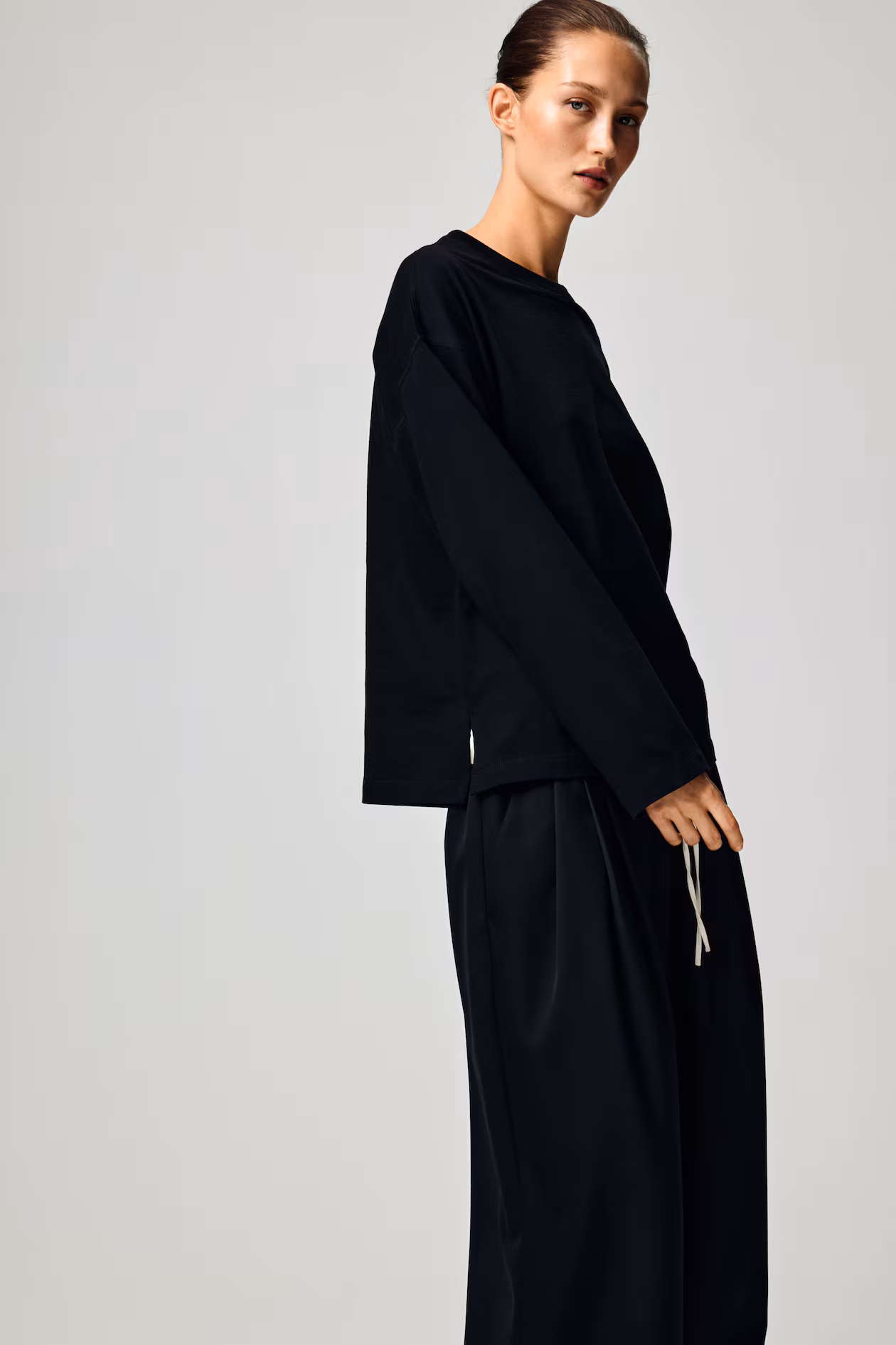 Top in soft cotton jersey. Ribbed round neckline, dropped shoulders, and long sleeves.