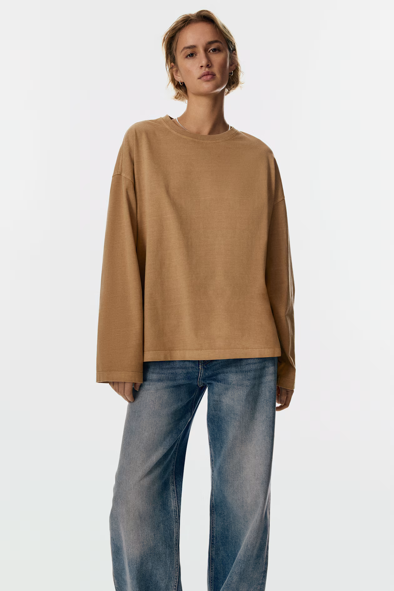 Top in soft cotton jersey. Ribbed round neckline, dropped shoulders, and long sleeves.