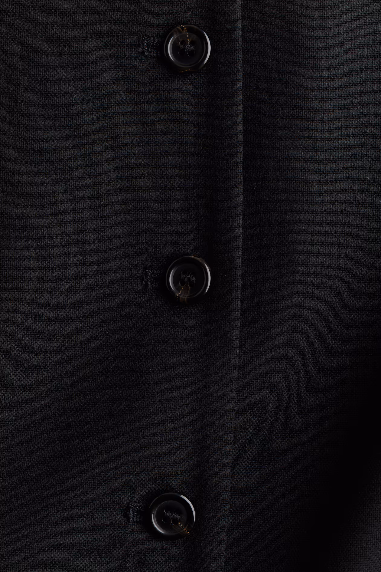 Long, fitted vest in woven fabric. Round neckline, buttons at front, and welt front pockets. Vent at back. Lined.