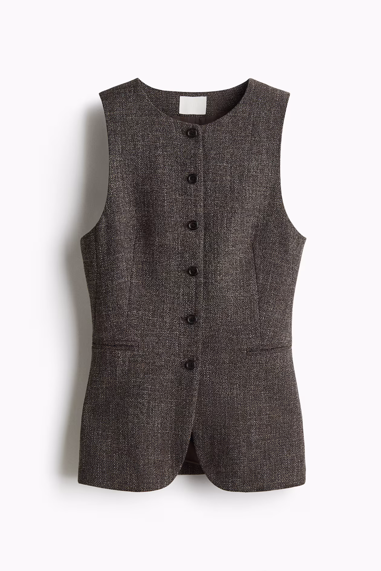 Long, fitted vest in woven fabric. Round neckline, buttons at front, and welt front pockets. Vent at back. Lined.