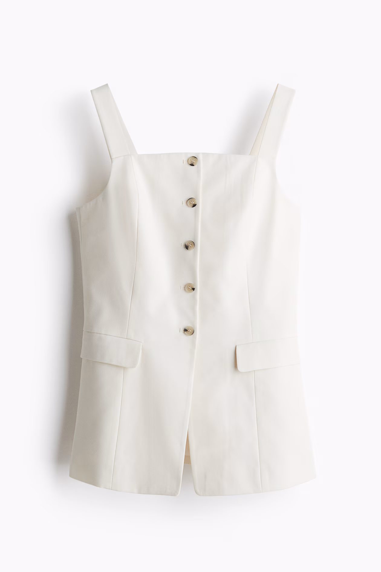 Long, fitted vest in woven fabric. Wide shoulder straps, straight neckline, buttons at front, and front pockets with flap. Lined.