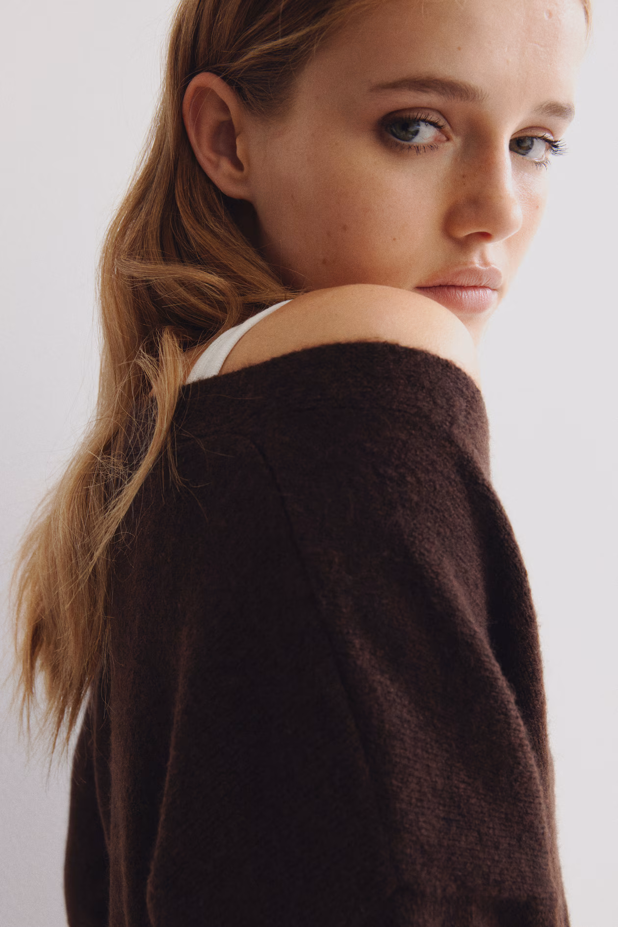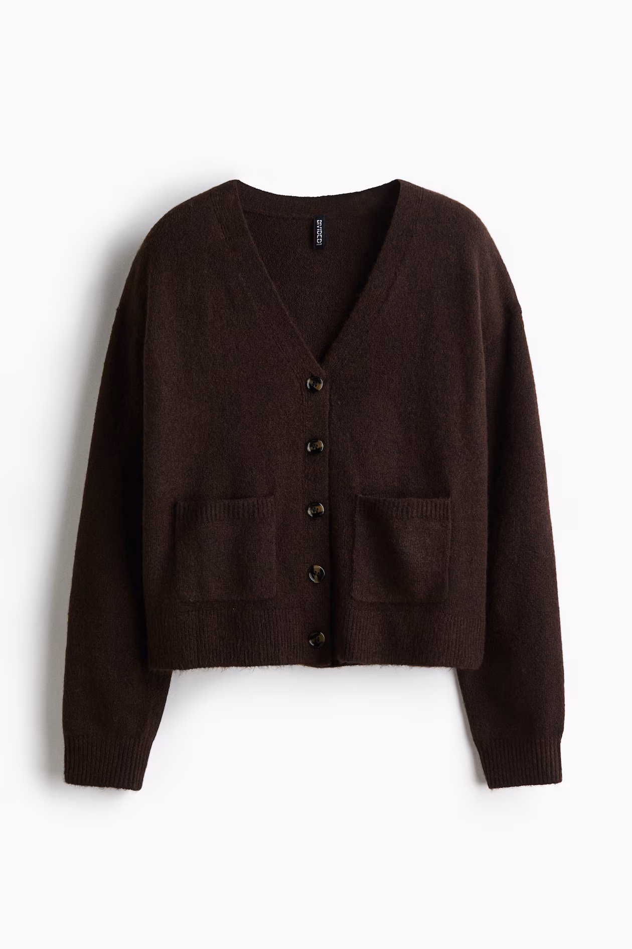 Loose-fit cardigan in a soft knit. V-neck, buttons at front, and open front pockets. Dropped shoulders, long sleeves, and ribbing at cuffs and hem.