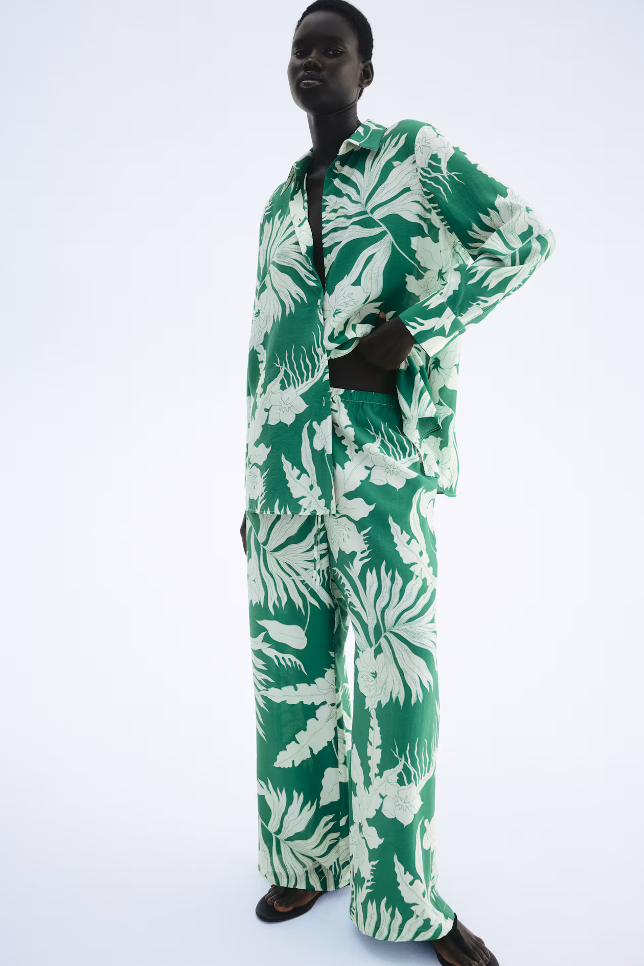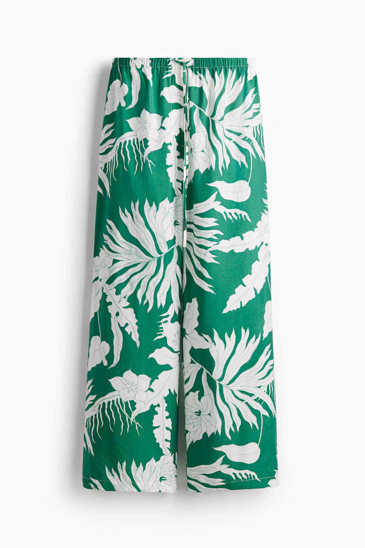 Loose-fit pants in woven fabric. High waist, narrow drawstring and covered elastic at waistband, and straight legs.