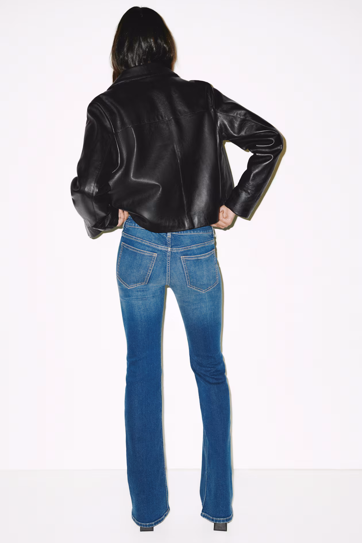 Jeans in denim with gentle stretch for good comfort. Slim fit from waist to thigh and flared from knees to hems. Low waist and zip fly with button. Mock front pockets, a coin pocket, and open back pockets. Flared, regular-length legs, designed to fall at top of foot with little or no stacking. A fashion icon from the 70s to now.