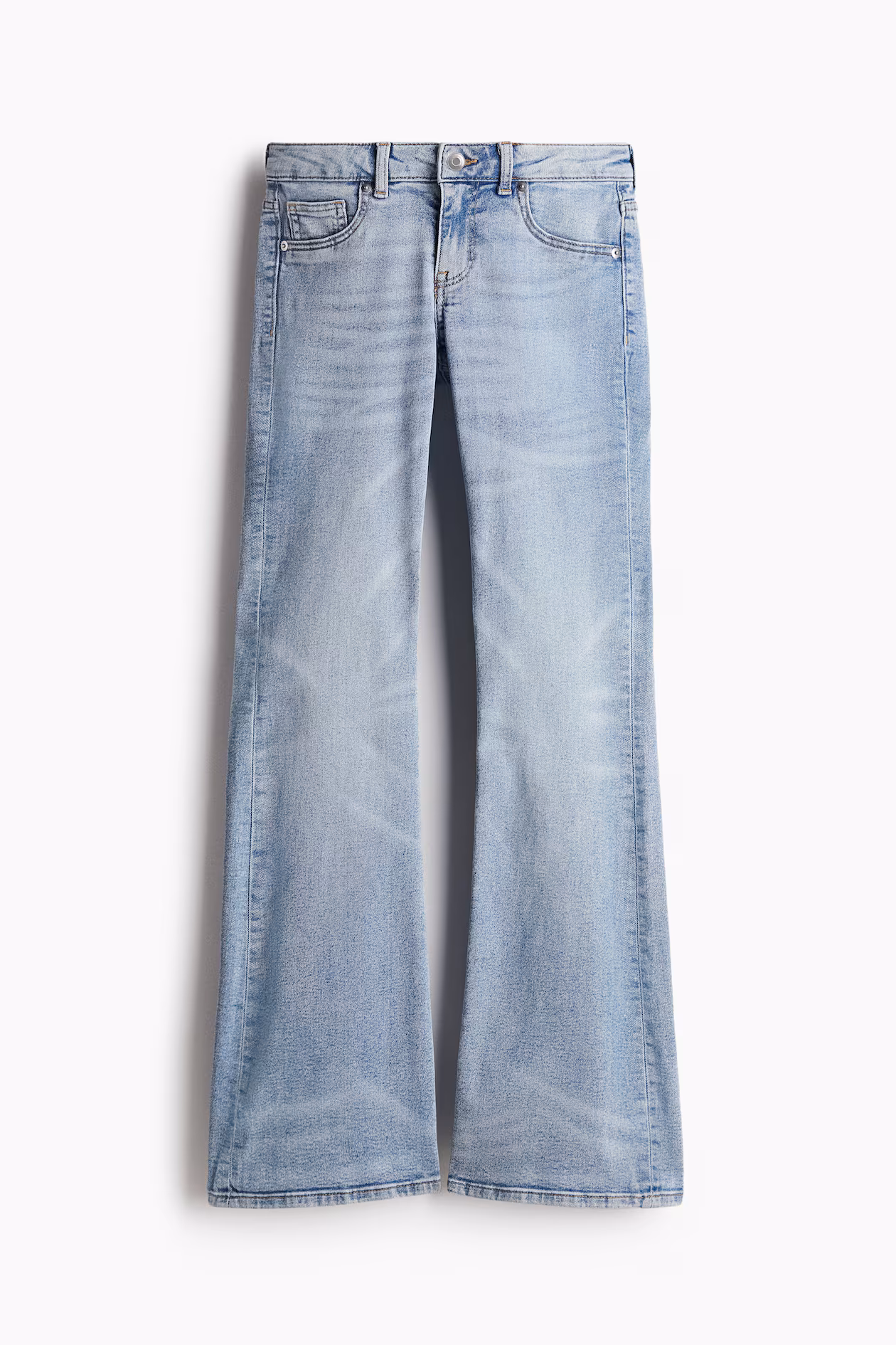 Jeans in denim with gentle stretch for good comfort. Slim fit from waist to thigh and flared from knees to hems. Low waist and zip fly with button. Mock front pockets, a coin pocket, and open back pockets. Flared, regular-length legs, designed to fall at top of foot with little or no stacking. A fashion icon from the 70s to now.