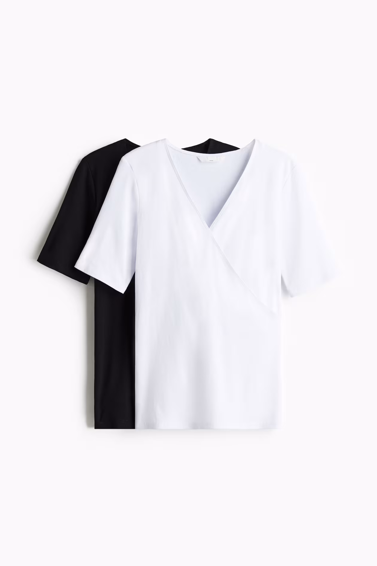 Fitted nursing tops in soft cotton jersey. V-neck, short sleeves, and overlapping section at upper front with a practical inner top for easier nursing access.