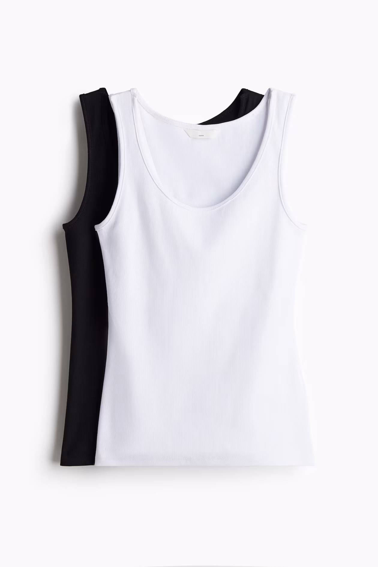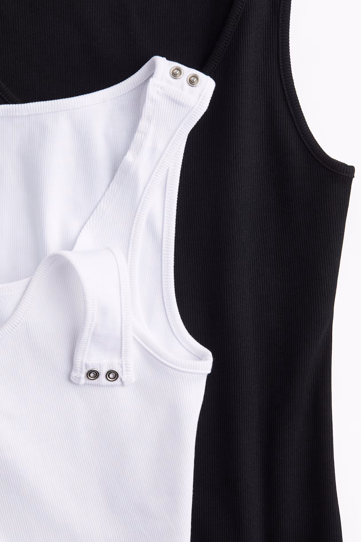 Nursing vest tops in ribbed cotton jersey with a deep, round neckline and functional press-stud fastening on the shoulder straps for easier nursing access.