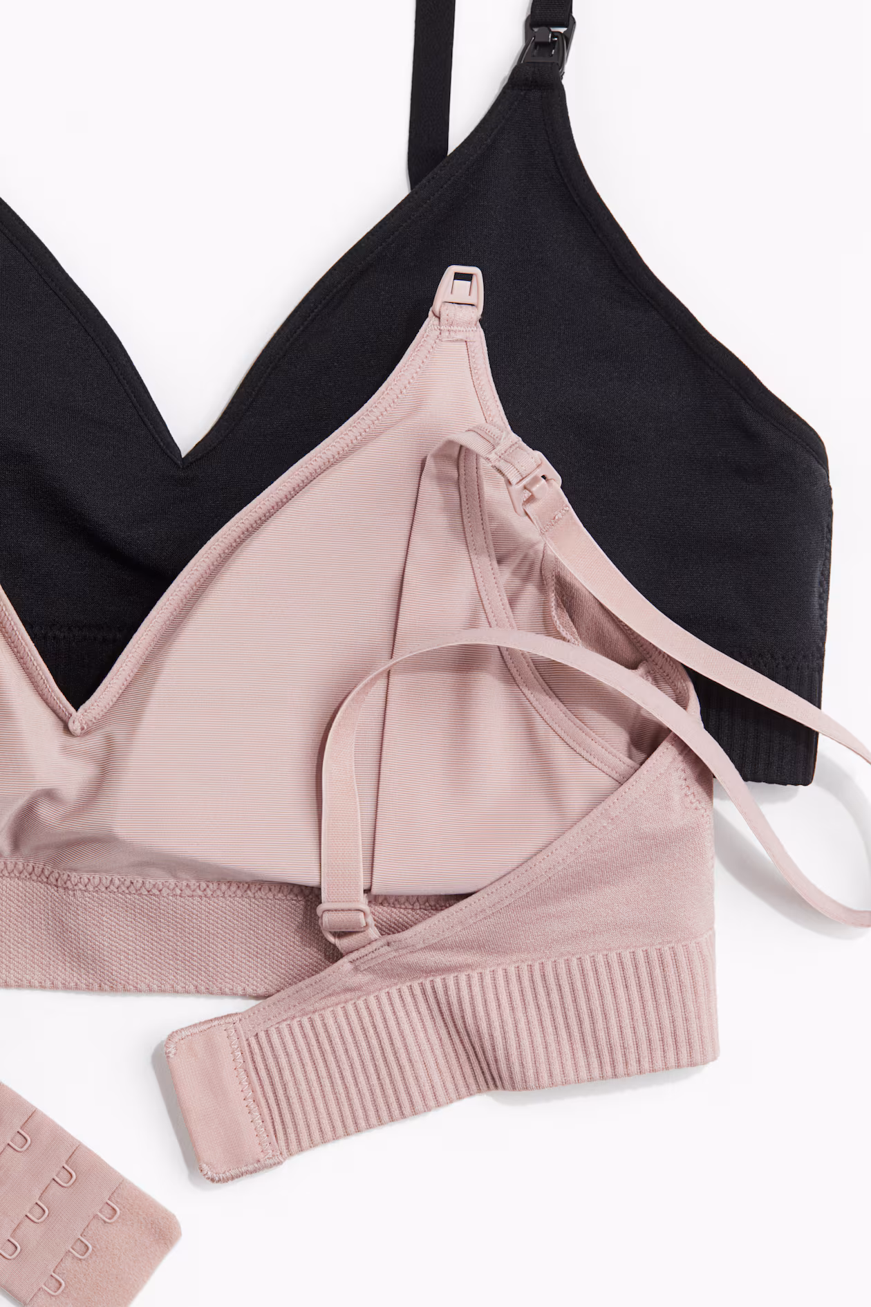 Soft-cup nursing bras. Adjustable shoulder straps, cups with opening, removable inserts, and space for nursing pads, and hook-and-eye fasteners at back. Designed with a minimum number of seams for seamless comfort on skin.