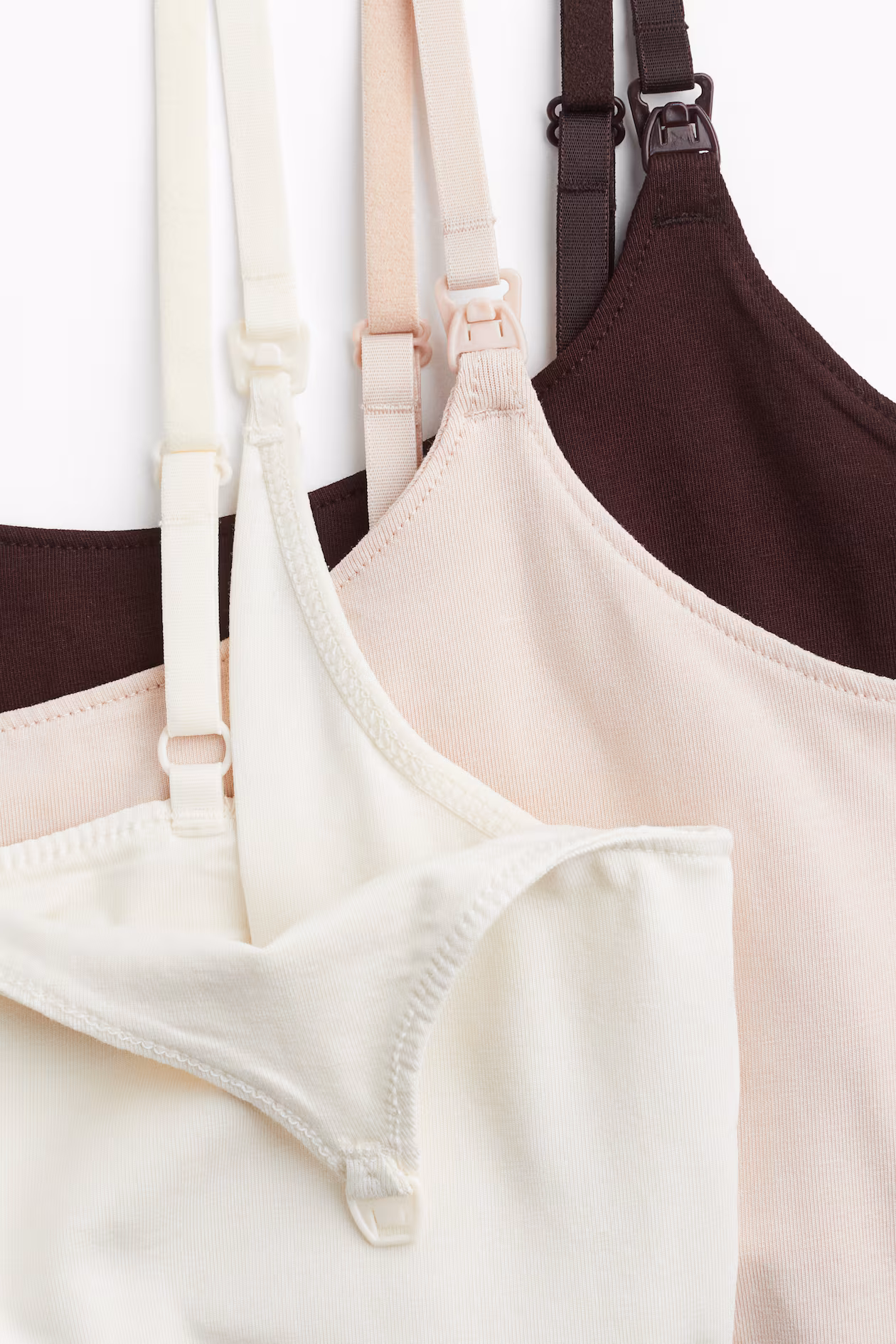 Nursing tops in soft cotton jersey with narrow, adjustable shoulder straps. Soft, integral top with elasticized lower edge and convenient fastening for easier nursing access.