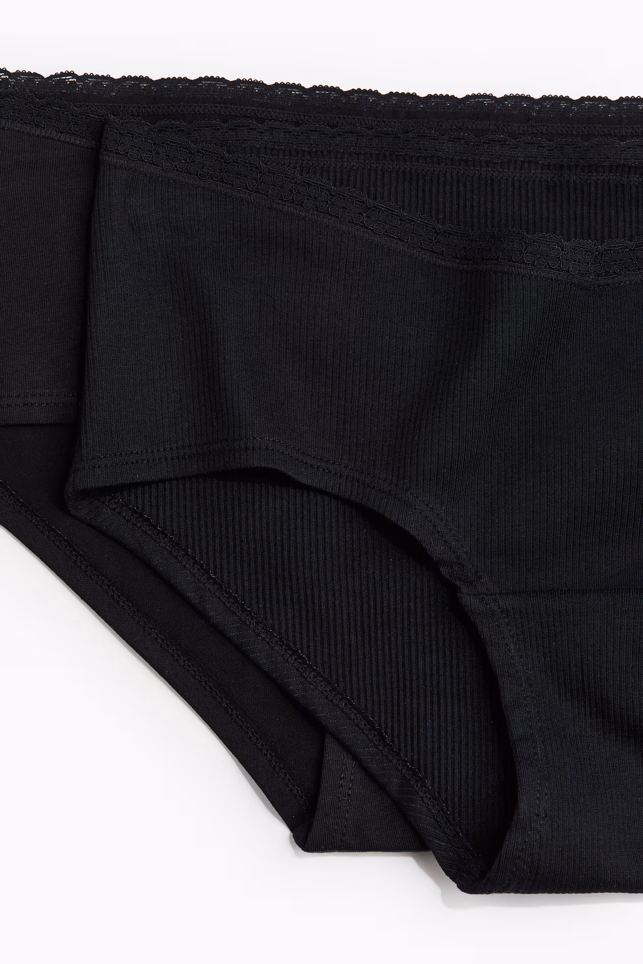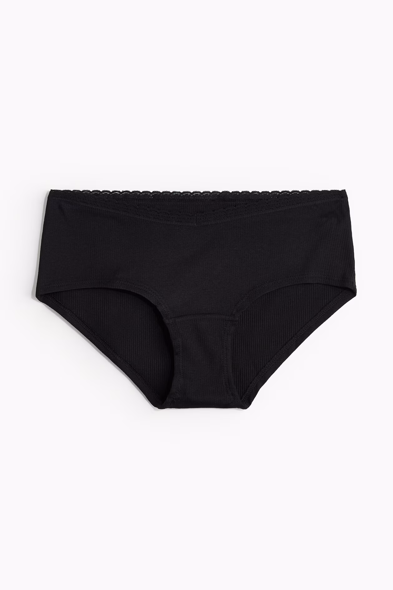 Hipster briefs in cotton jersey with lace trim at top, wide sides, and medium coverage at back. Lined gusset.