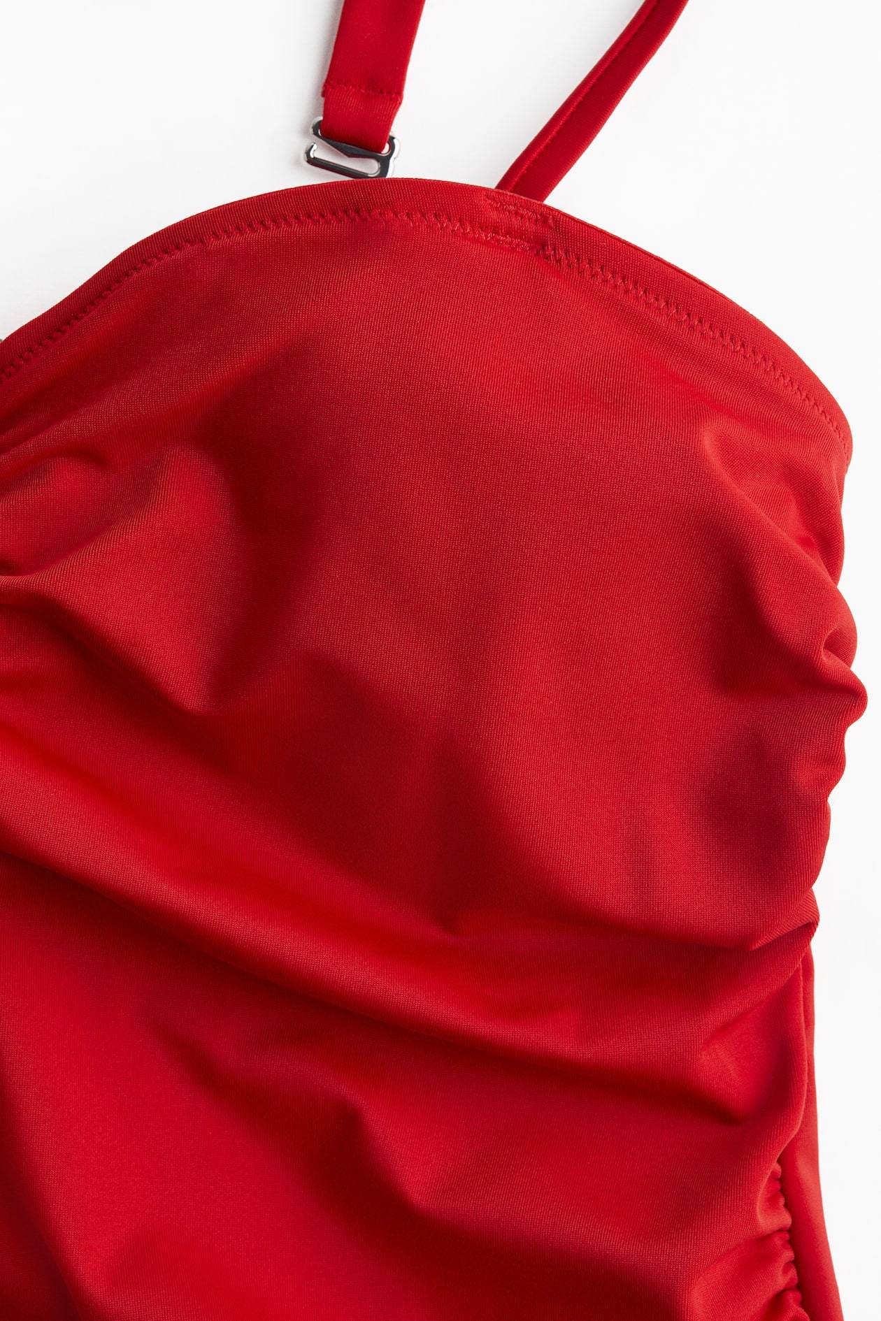 Fully lined bandeau swimsuit. Detachable, adjustable shoulder straps, silicone trim inside upper edge, and cups with removable inserts for shaping and good support. U-shaped wire at center bust and concealed elastic below bust for added support. Side-seam gathers for best fit over tummy. Medium coverage at back.