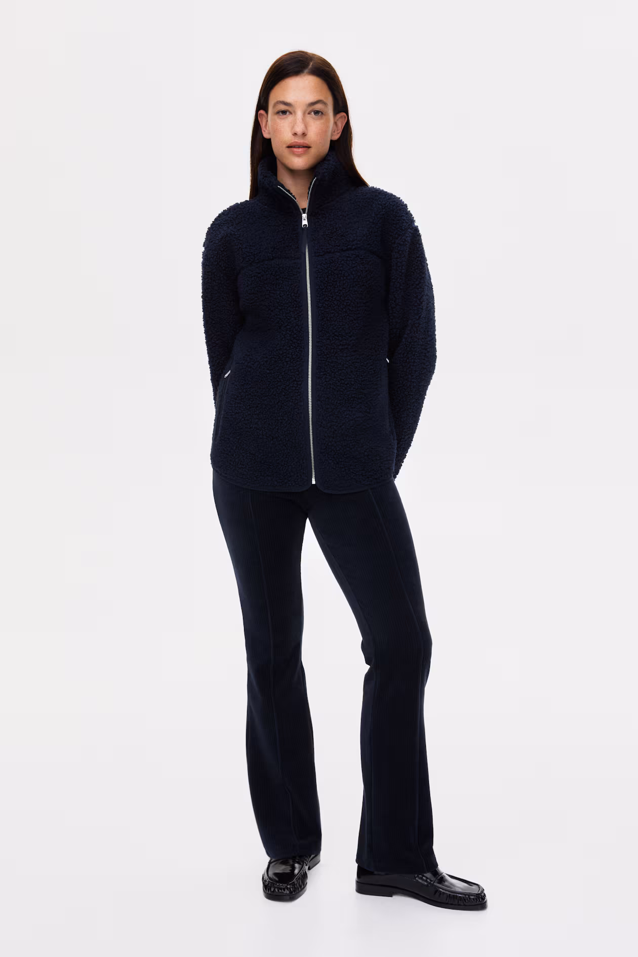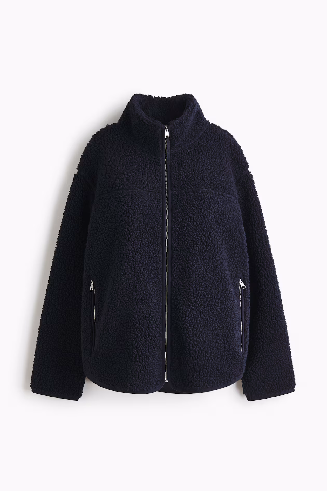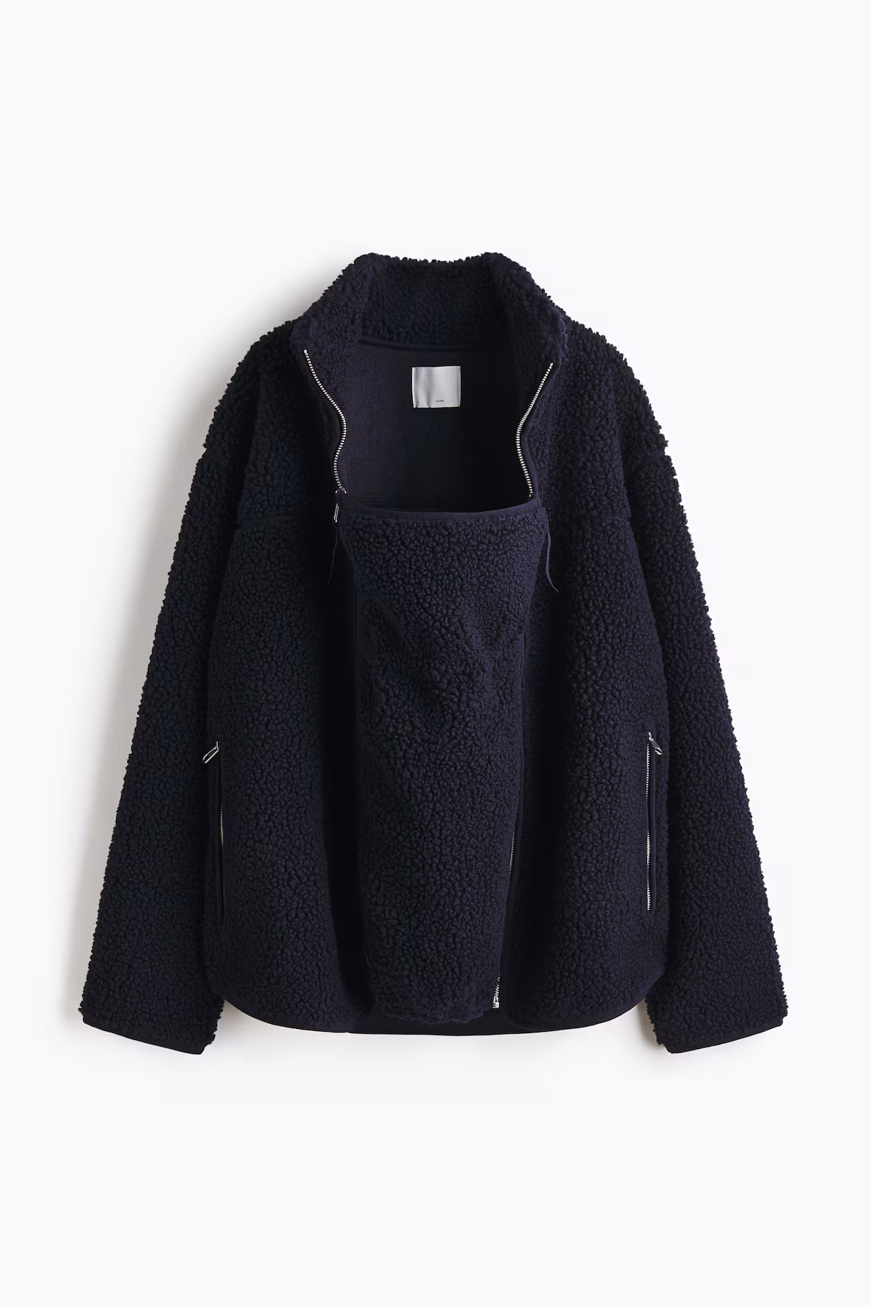 Loose-fit jacket in soft teddy fleece for wear during and after pregnancy. Stand-up collar, zipper at front, and side pockets with zipper. Equipped with a detachable, jersey-lined babywearing panel with covered elastic at upper and lower edges.