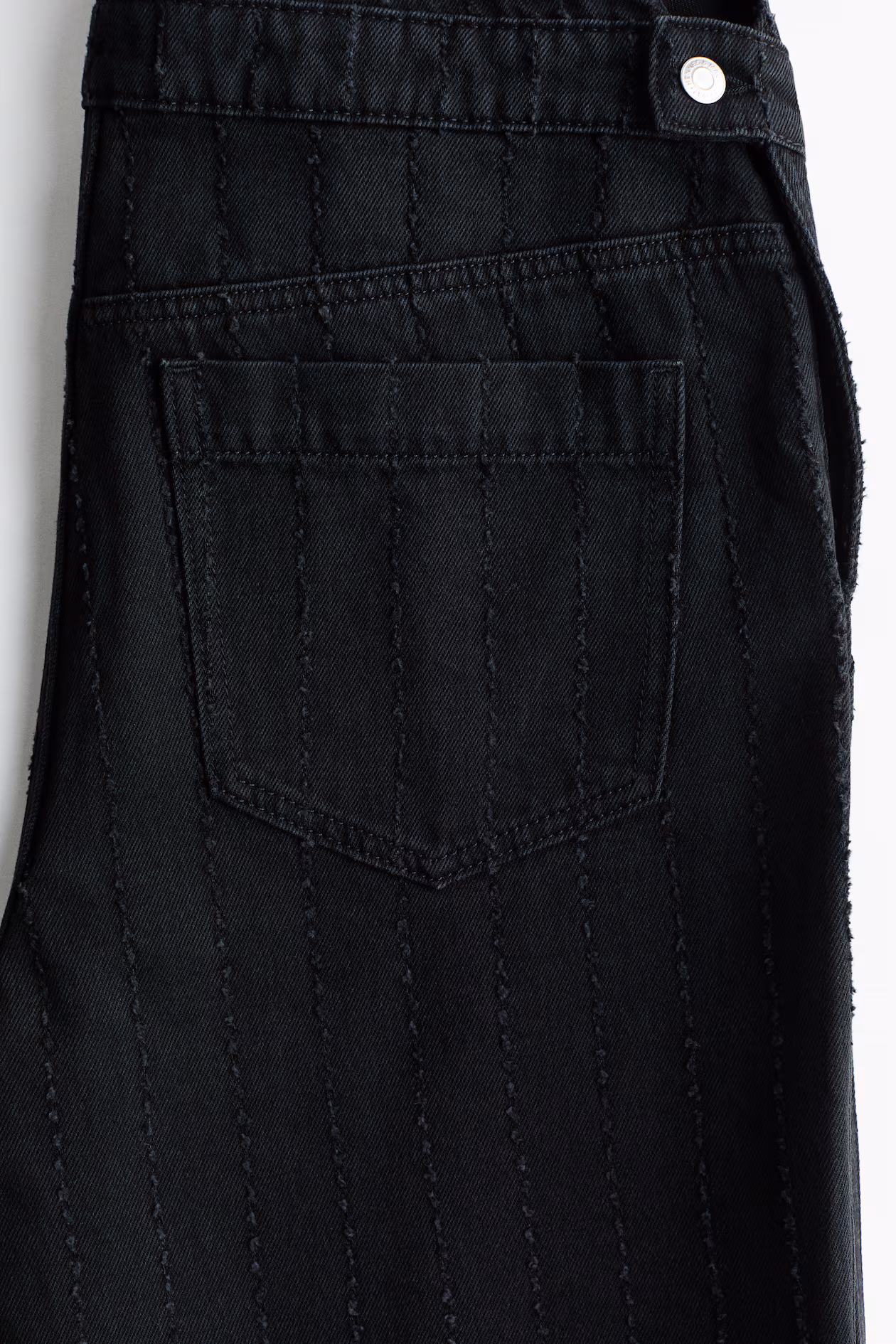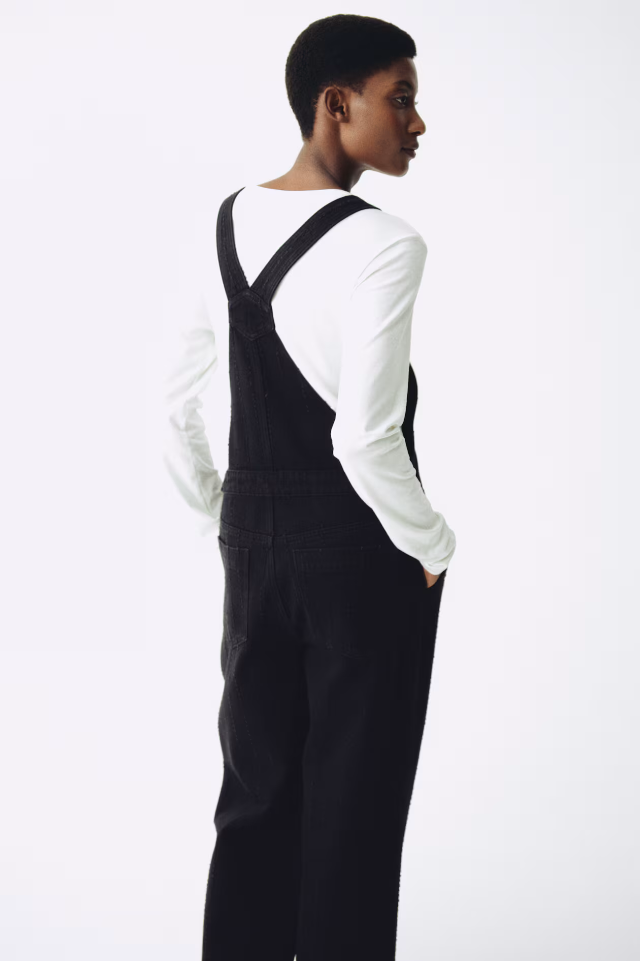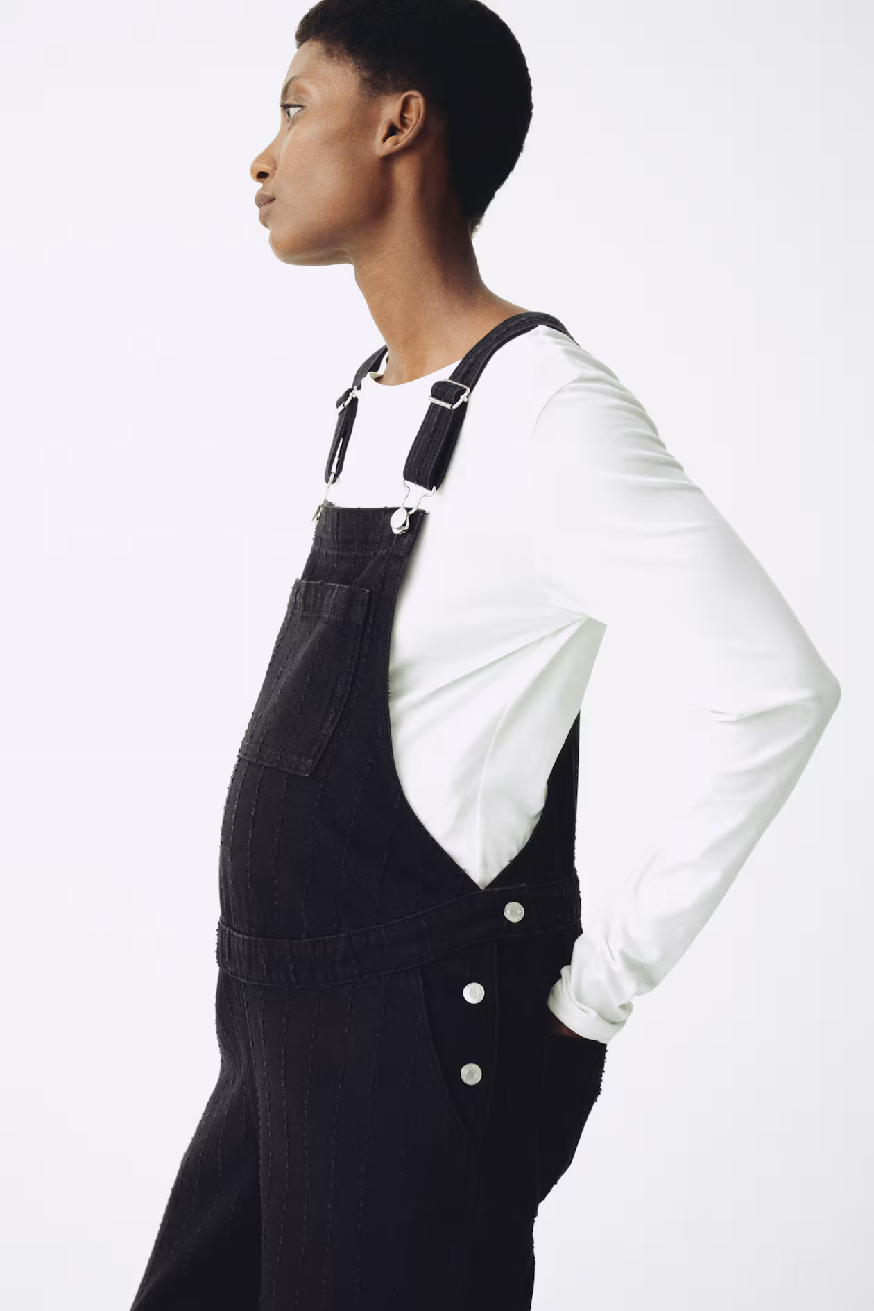 Overalls in rigid cotton denim. Adjustable shoulder straps, buttons at sides, and straight legs. Bib pocket, diagonal side pockets, and open back pockets. For wear during and after pregnancy.