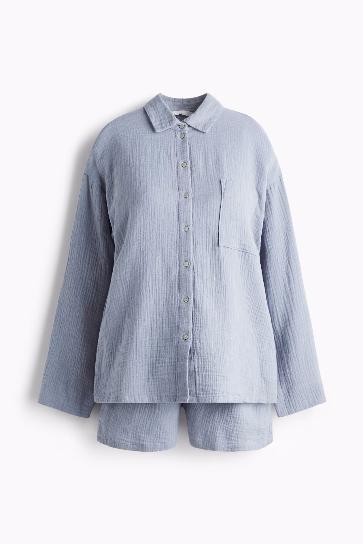 Pajamas in soft cotton muslin with a shirt and shorts. Shirt with a collar, buttons at front, and a patch chest pocket. Dropped shoulders and long sleeves. Shorts with a low waist and elasticized, drawstring waistband for added comfort during and after pregnancy.