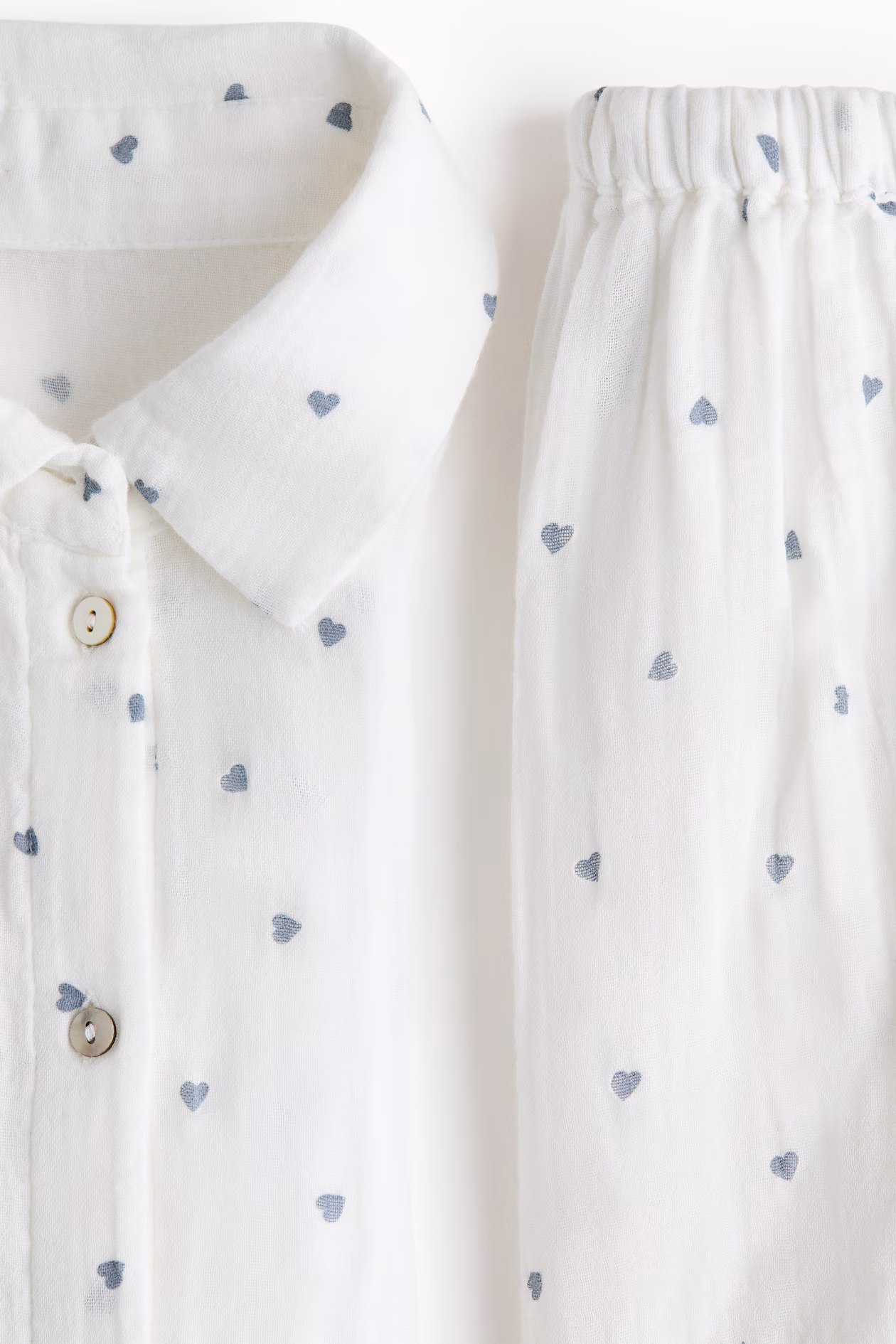 Pajamas in soft cotton muslin with a shirt and shorts. Shirt with a collar, buttons at front, and a patch chest pocket. Dropped shoulders and long sleeves. Shorts with a low waist and elasticized, drawstring waistband for added comfort during and after pregnancy.