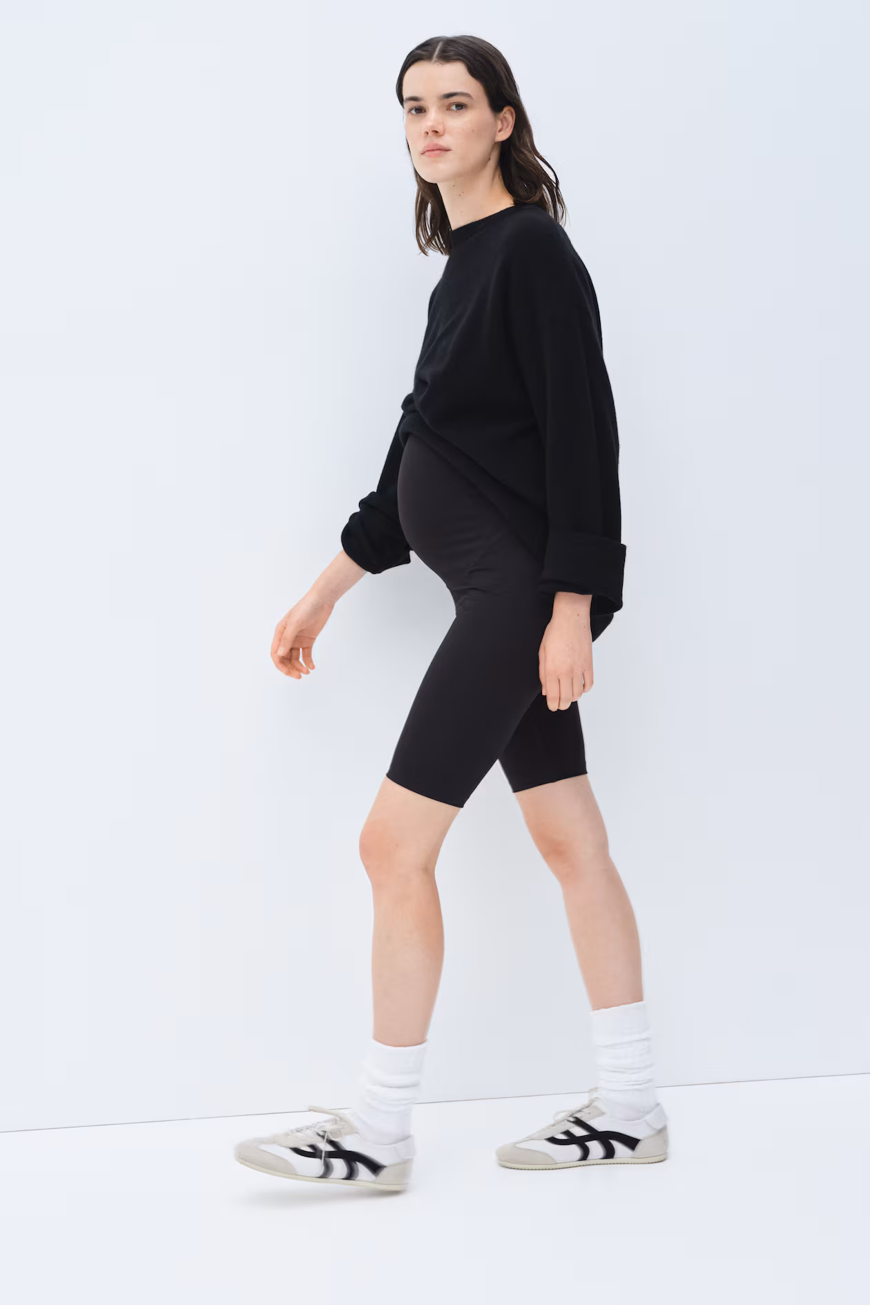 Knee-length sports bike shorts in fast-drying, functional fabric to help keep you dry and cool while exercising. Wide, foldover waistband panel for comfort during and after pregnancy.