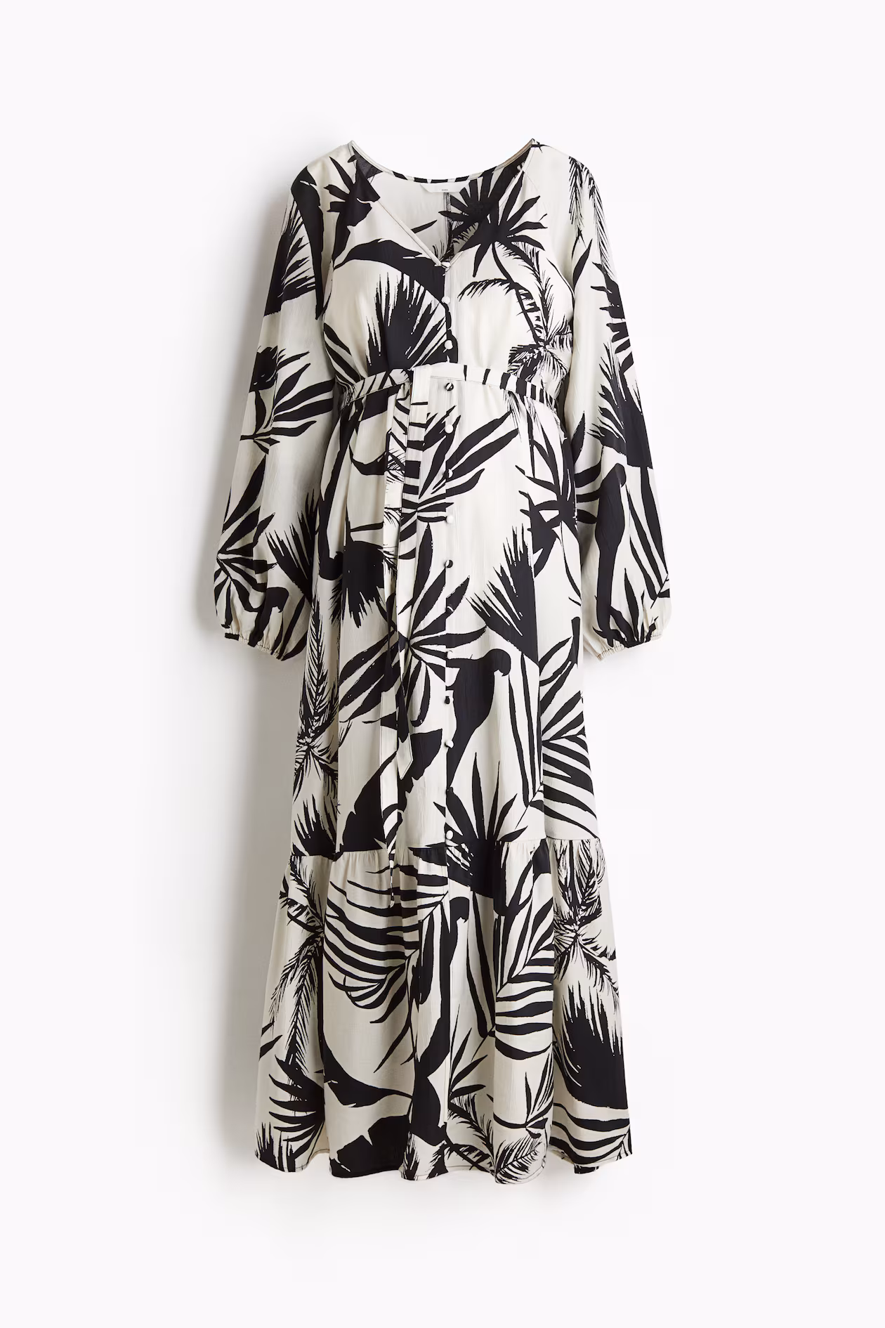 Ankle-length dress in slightly textured, woven fabric. V-neck, covered buttons at front, and removable tie-belt below bust. Long, raglan balloon sleeves with narrow elastic at cuffs. Gathered tier above knees for added volume. Unlined. For wear during and after pregnancy.