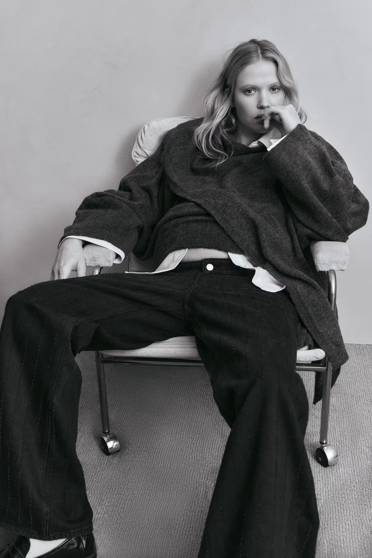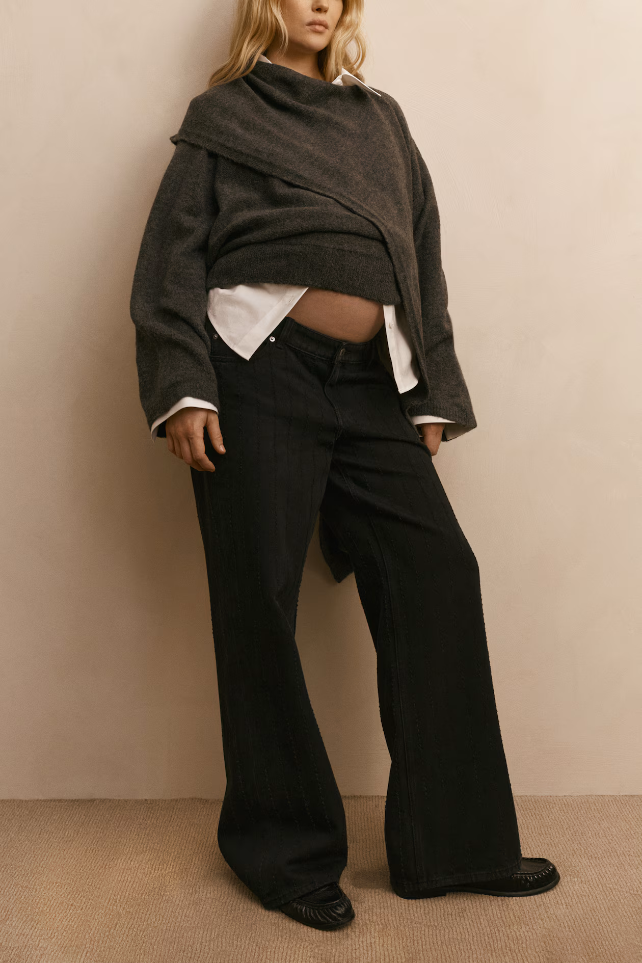 Loose-fit, 5-pocket jeans in rigid cotton denim that feels firm at first, softening and relaxing with wear. Low waist, zip fly with button, covered elastic at sides, and wide legs. Adjustable elastic concealed in waistband for adjustment of waist width. For wear during and after pregnancy.