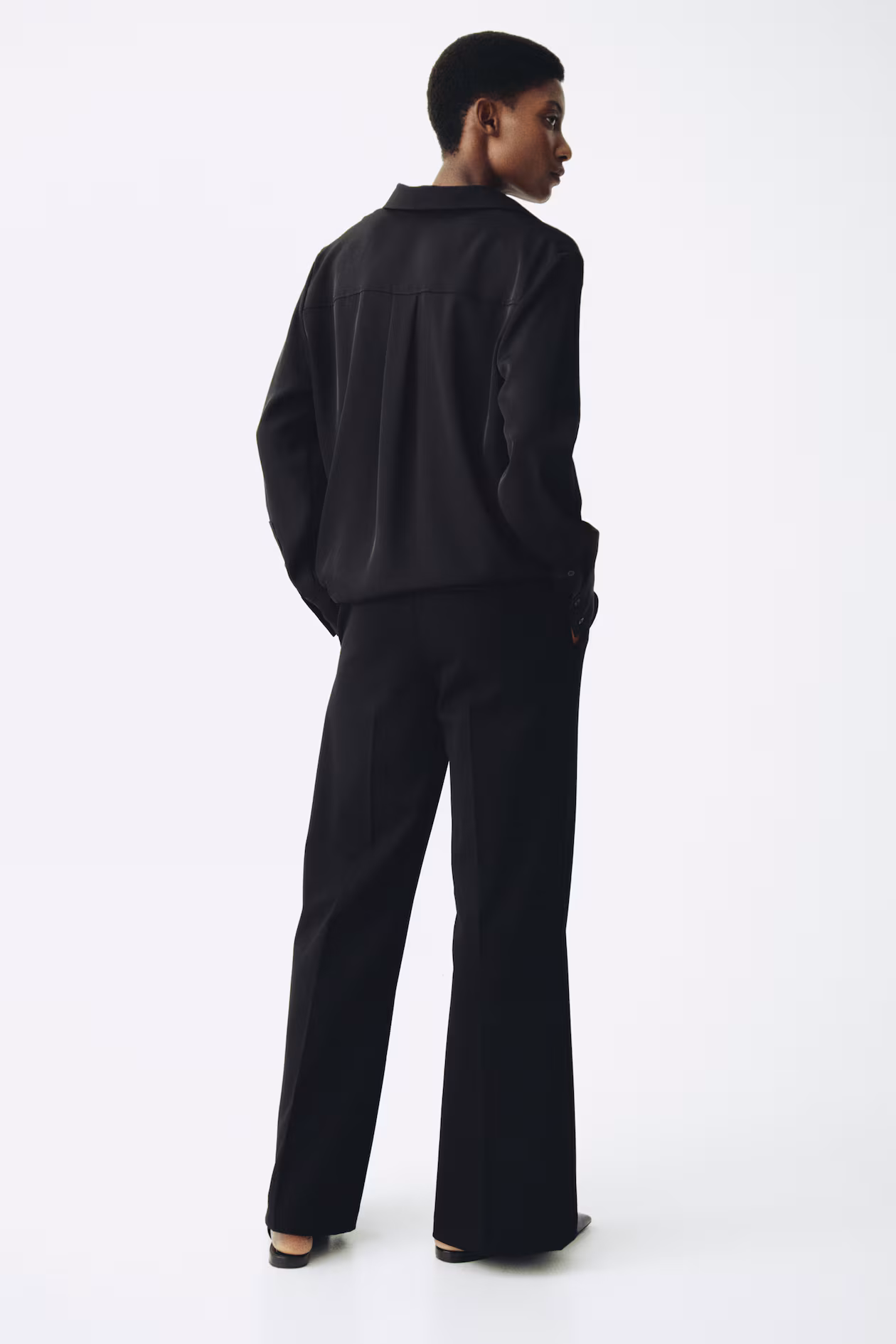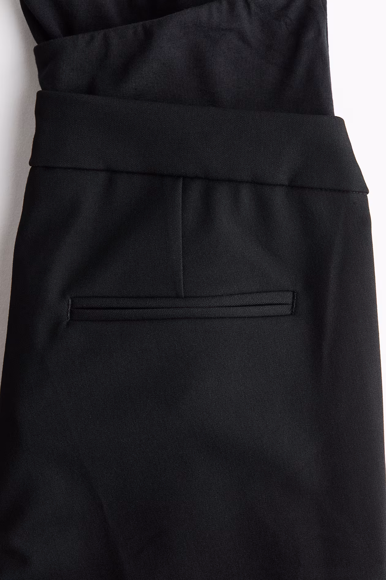 Pants in soft twill with creases at front and back. High waist, wide waistband panel in jersey for best fit, concealed elastic at waistband, and a mock fly. Diagonal side pockets, welt back pockets, and bootcut legs.