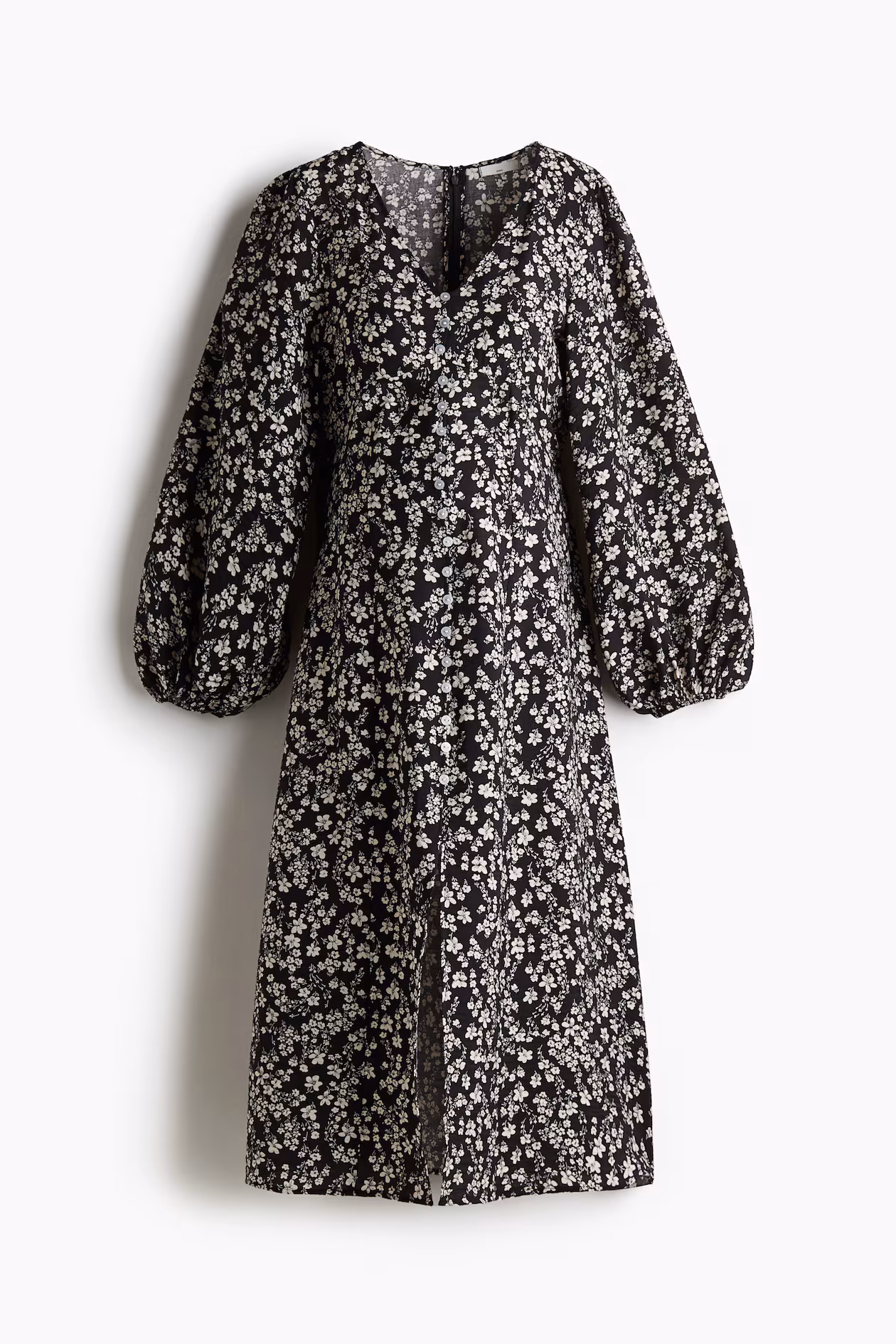Dress in woven fabric. V-neck at front, concealed zipper at back with hook-and-eye fastener, and decorative buttons at front finishing in a slit. Seam below bust, narrow elastic at back of waist, and long balloon sleeves with narrow elastic at cuffs. Unlined.