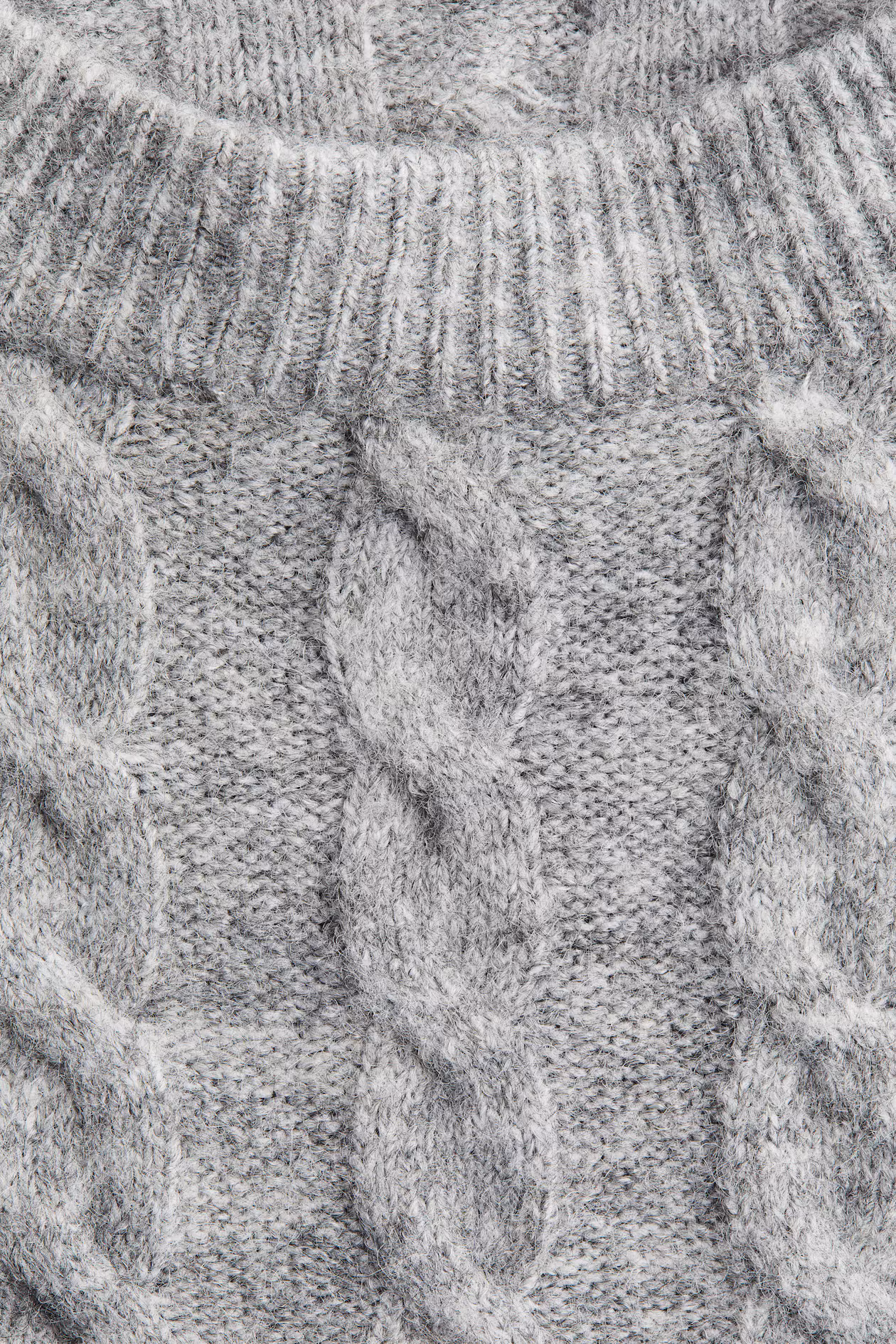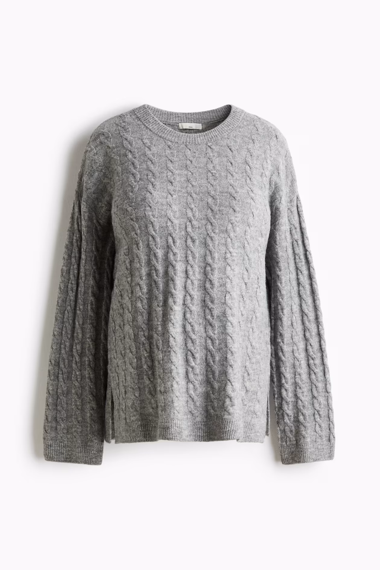 Soft, cable-knit sweater. Round neckline, dropped shoulders, and long sleeves. Straight hem with slit at sides. Ribbing at neckline, cuffs, and hem.