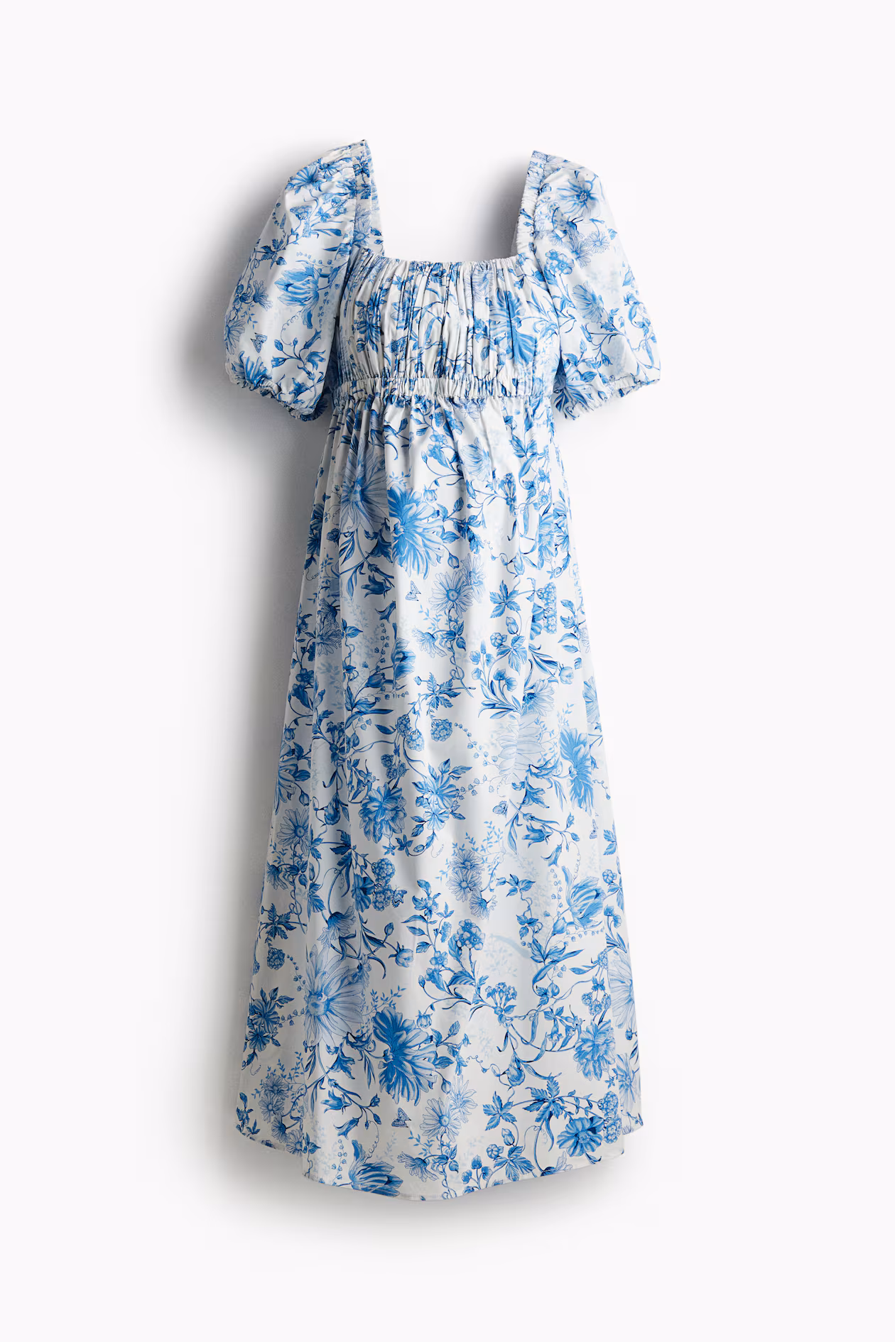 Ankle-length dress in crisp poplin made from a cotton and viscose blend. Square neckline and a gathered bodice with elastic at top and below bust. Covered elastic over shoulders, short balloon sleeves, and a concealed zipper at one side. Flared skirt. Unlined.