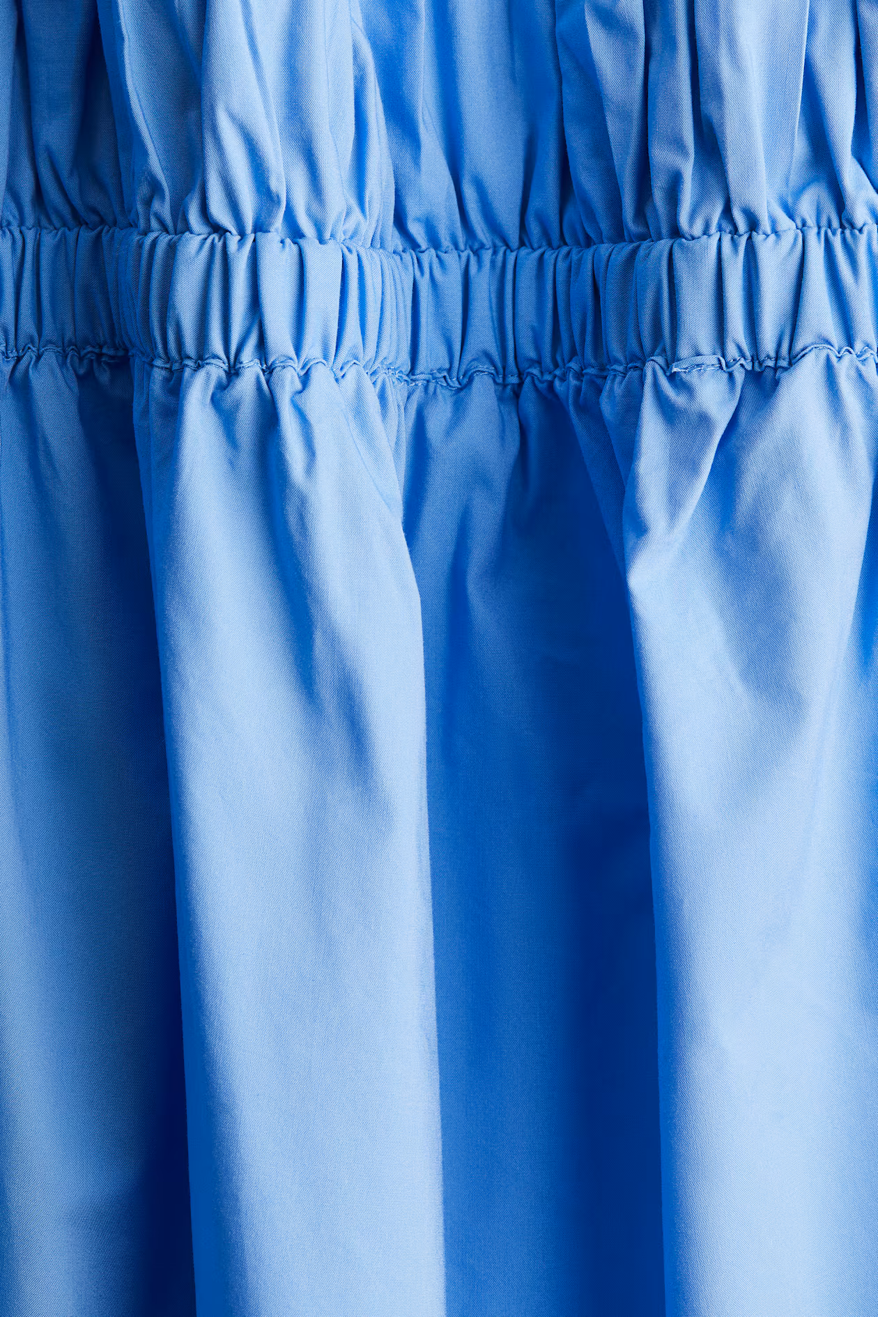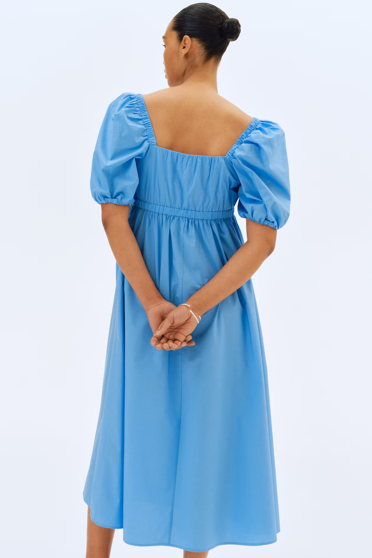 Ankle-length dress in crisp poplin made from a cotton and viscose blend. Square neckline and a gathered bodice with elastic at top and below bust. Covered elastic over shoulders, short balloon sleeves, and a concealed zipper at one side. Flared skirt. Unlined.
