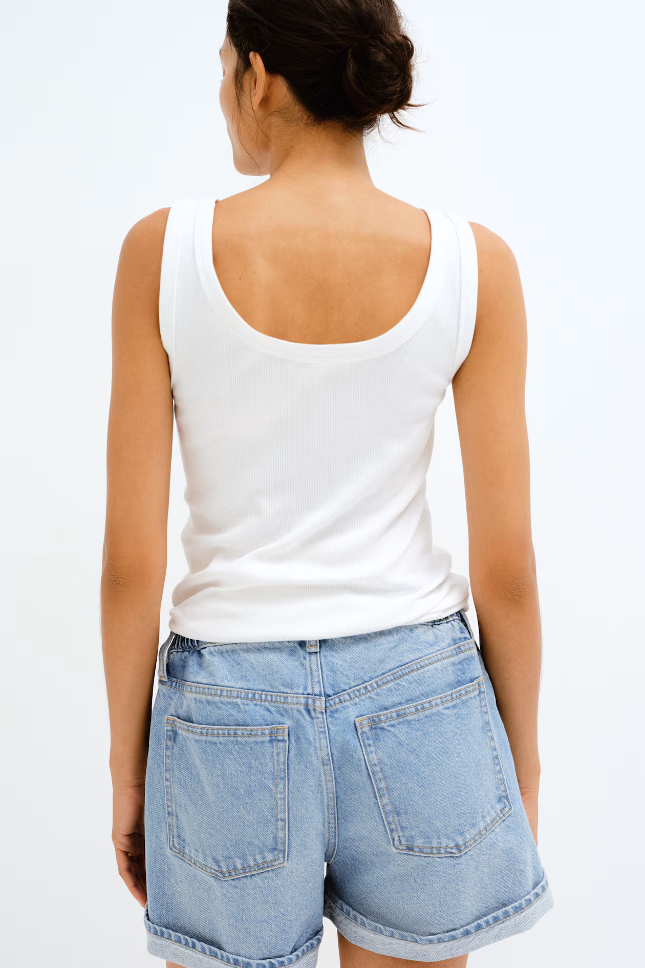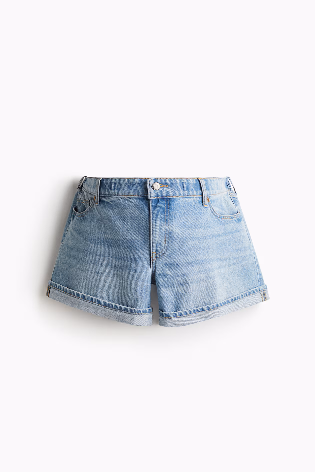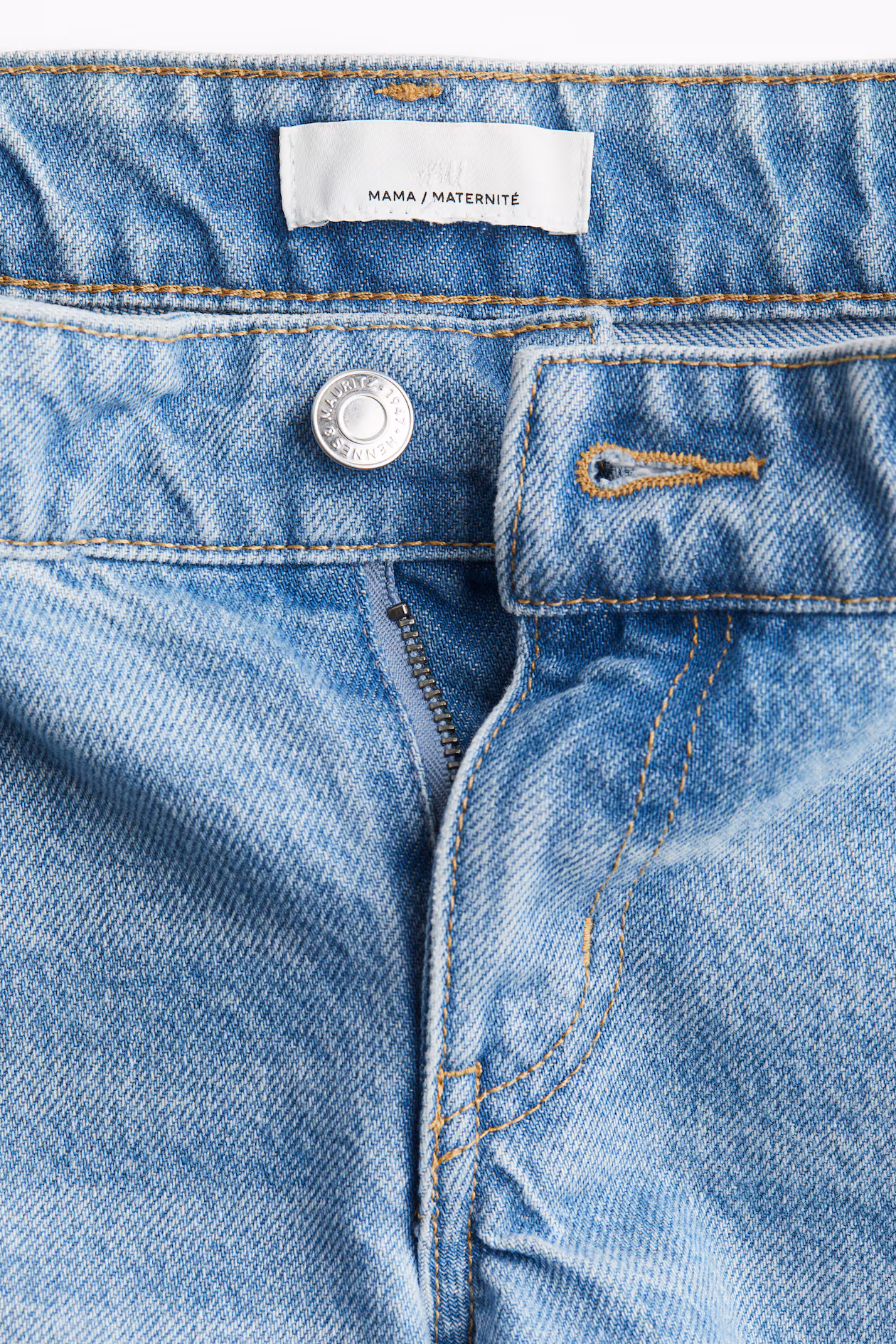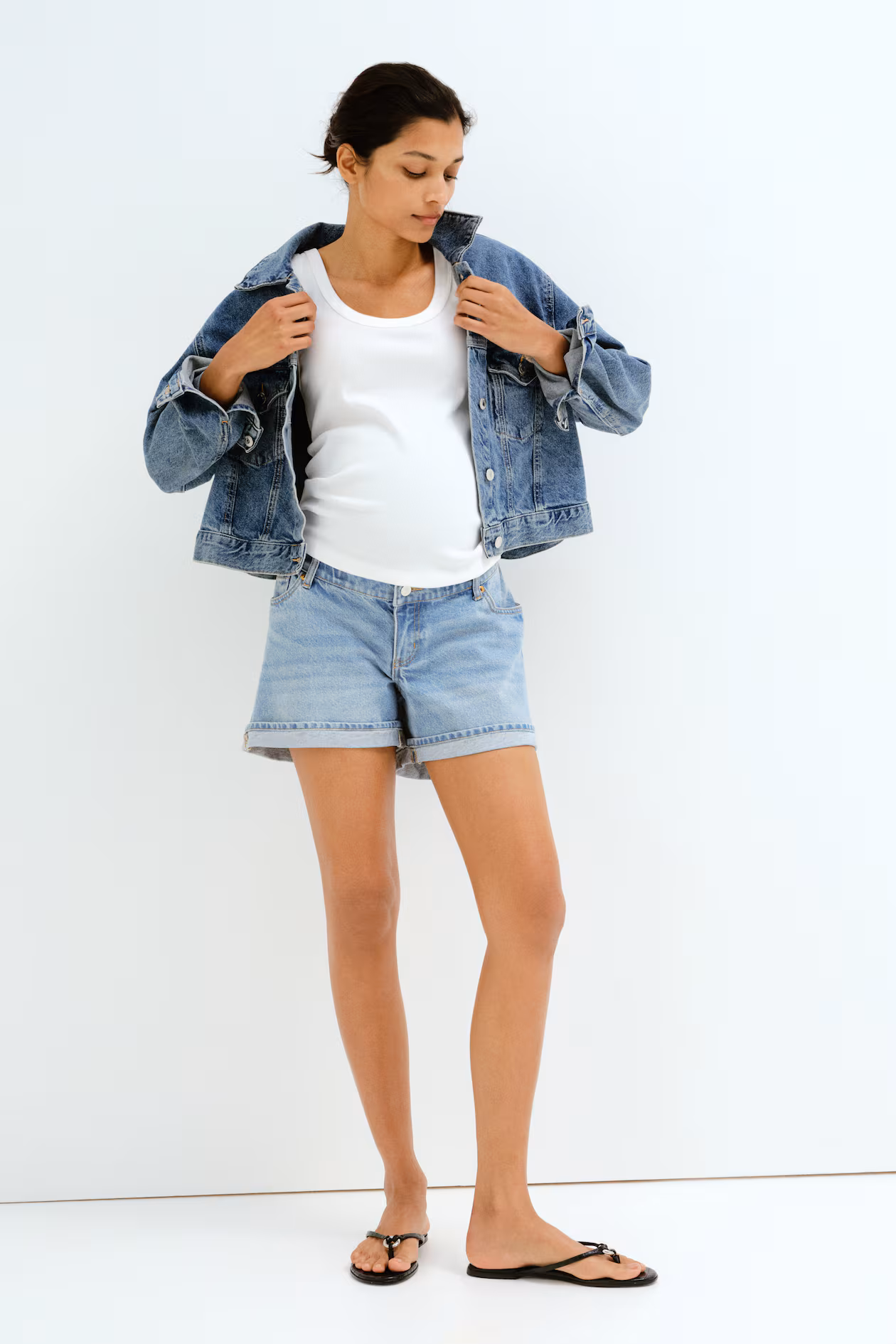 5-pocket shorts in cotton denim. Low waist featuring a zip fly with a button and concealed, adjustable elastication in the waistband so the waist width can be adjusted allowing the shorts to be worn both during pregnancy and afterwards. Relaxed fit with fold-up hems.