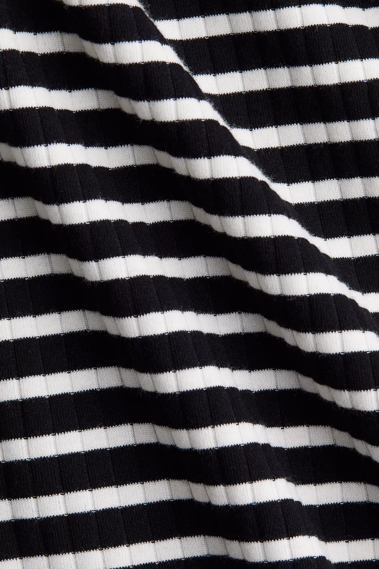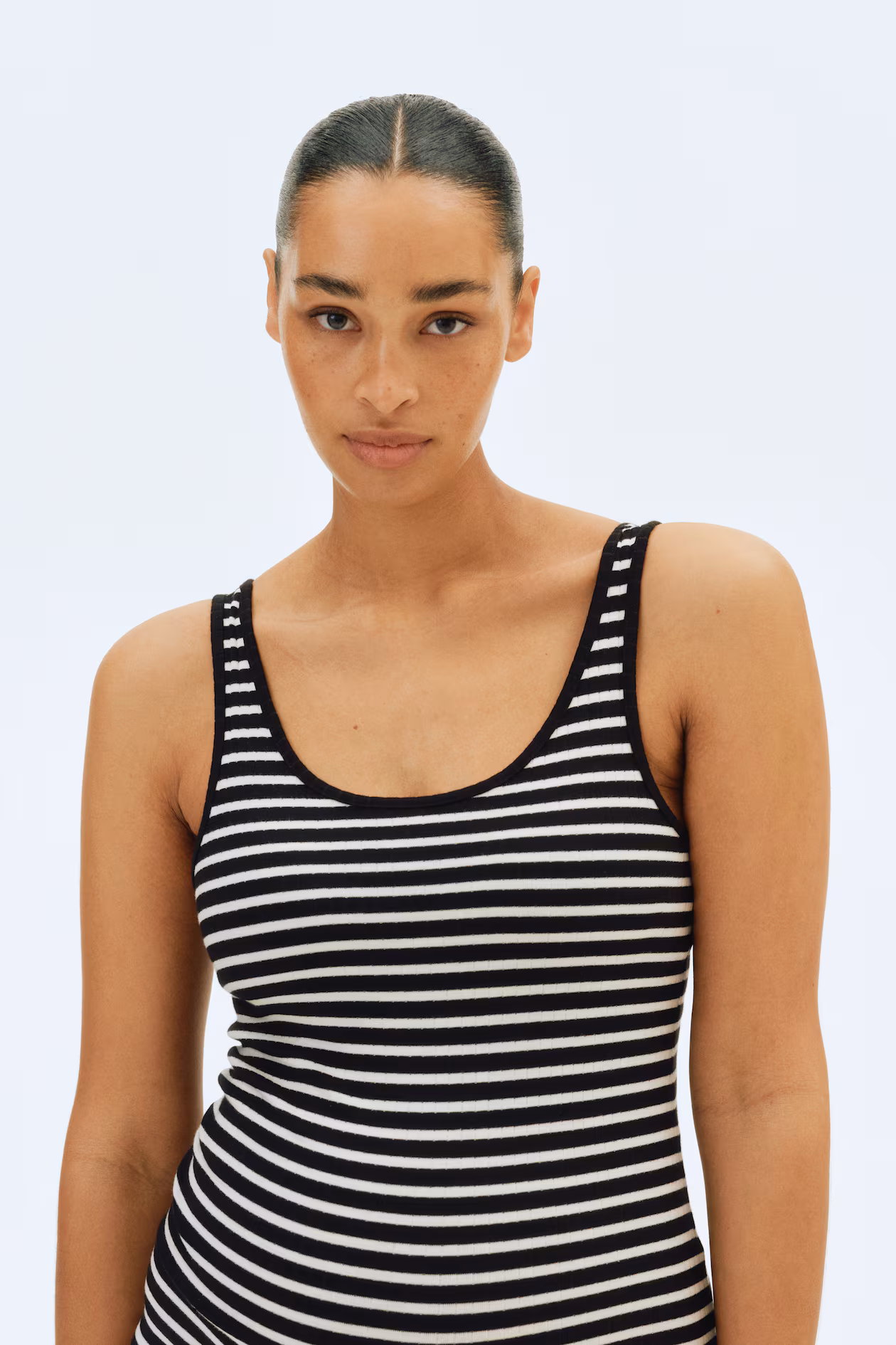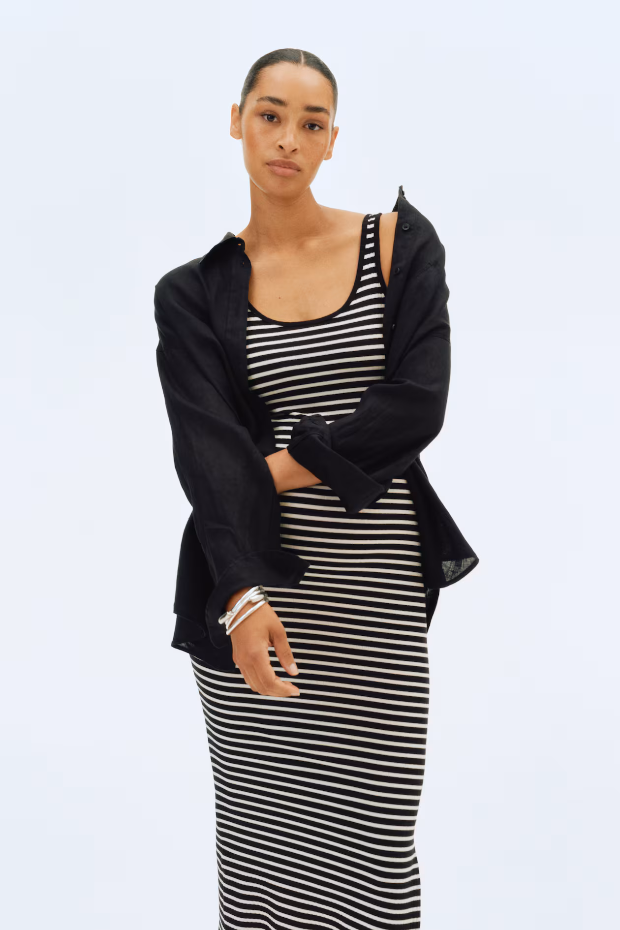 Fitted, calf-length dress in fine-knit cotton. Wide shoulder straps, scoop neck, and a straight hem with slit at one side. Narrow trim at neckline and armholes.
