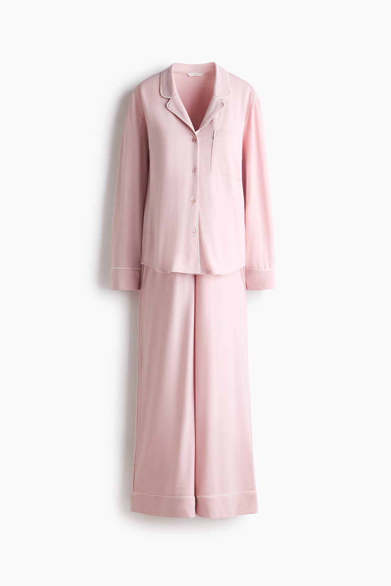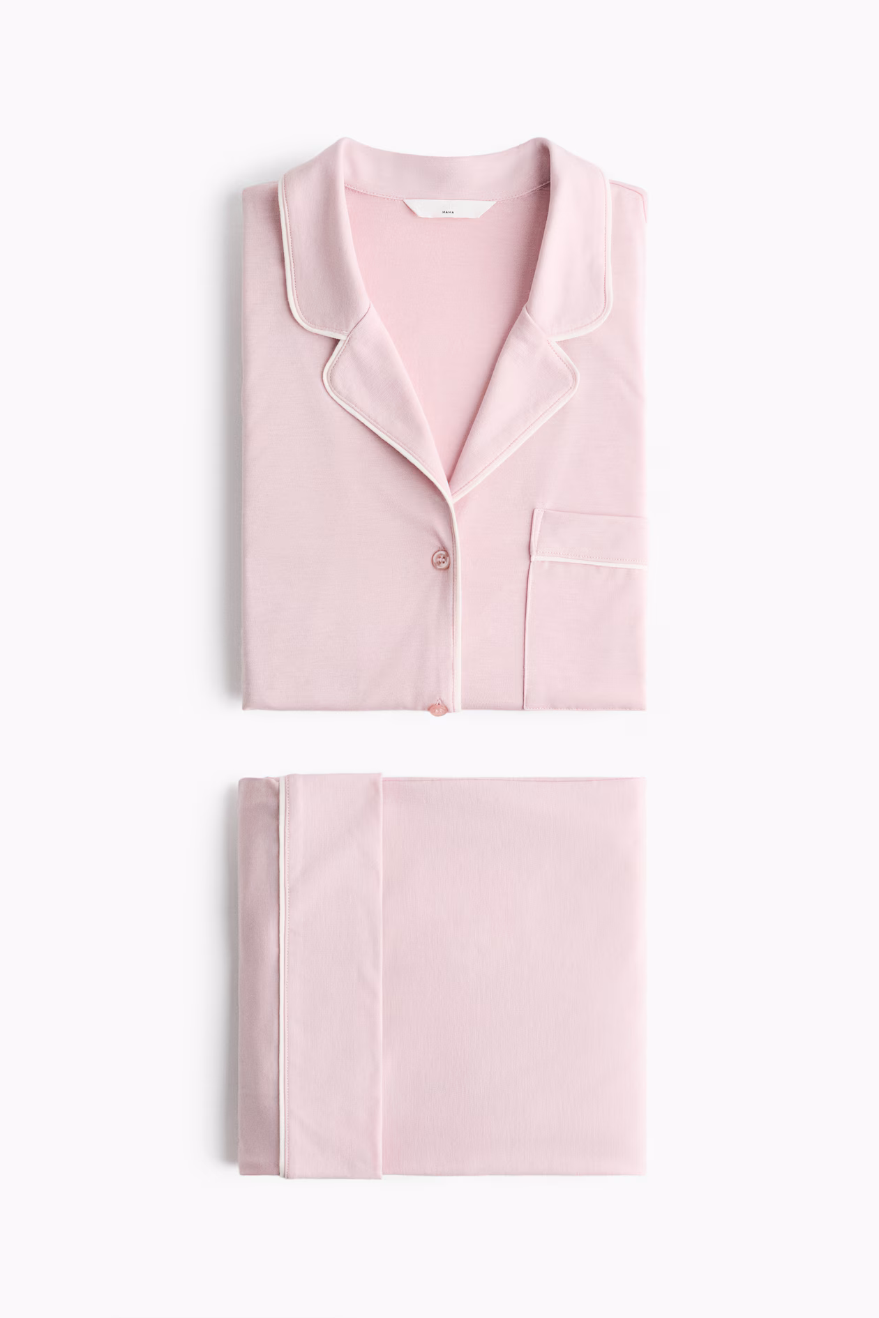 Pajama shirt and pants, both in soft jersey with delicate piping. Shirt with a resort collar, buttons at front, and an open chest pocket. Pants with soft elastic at waistband for added comfort during and after pregnancy.
