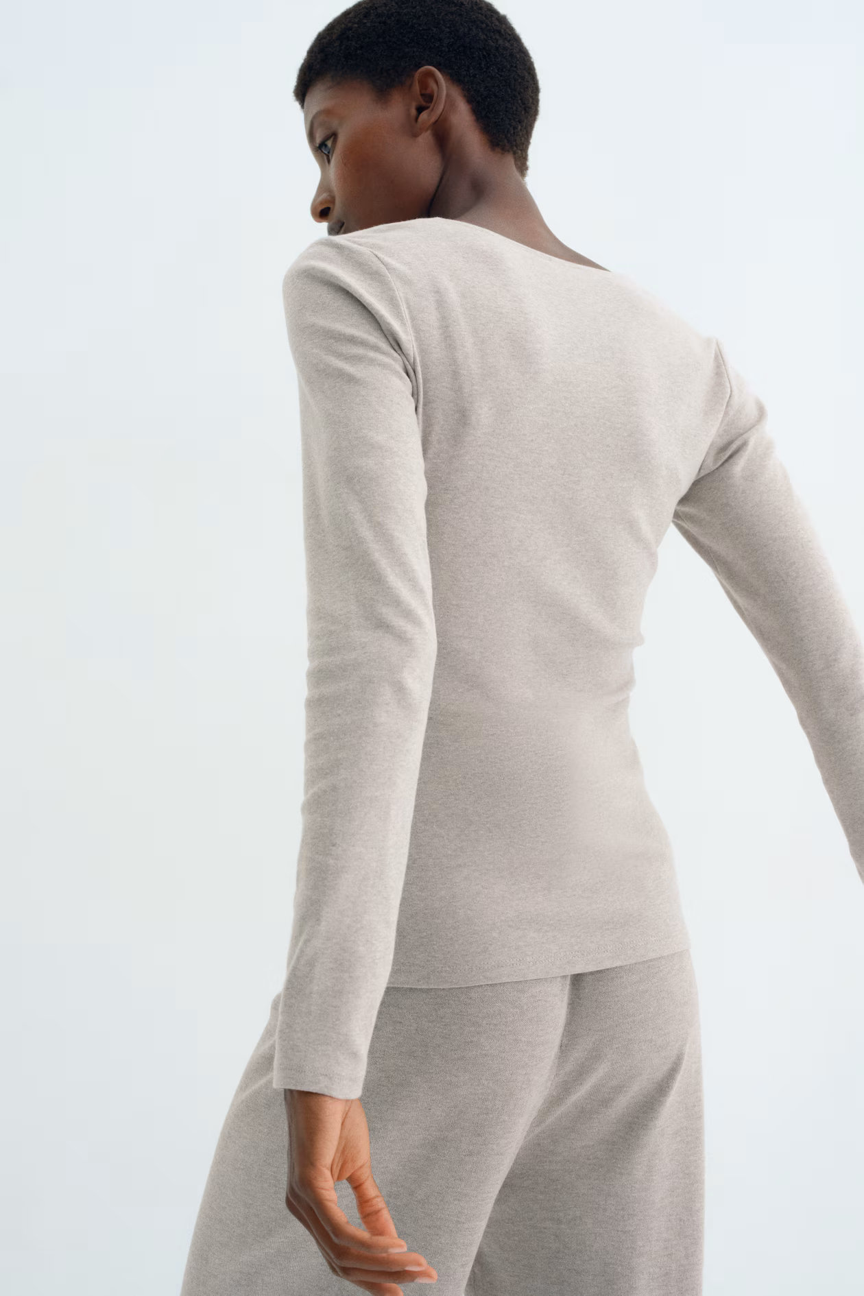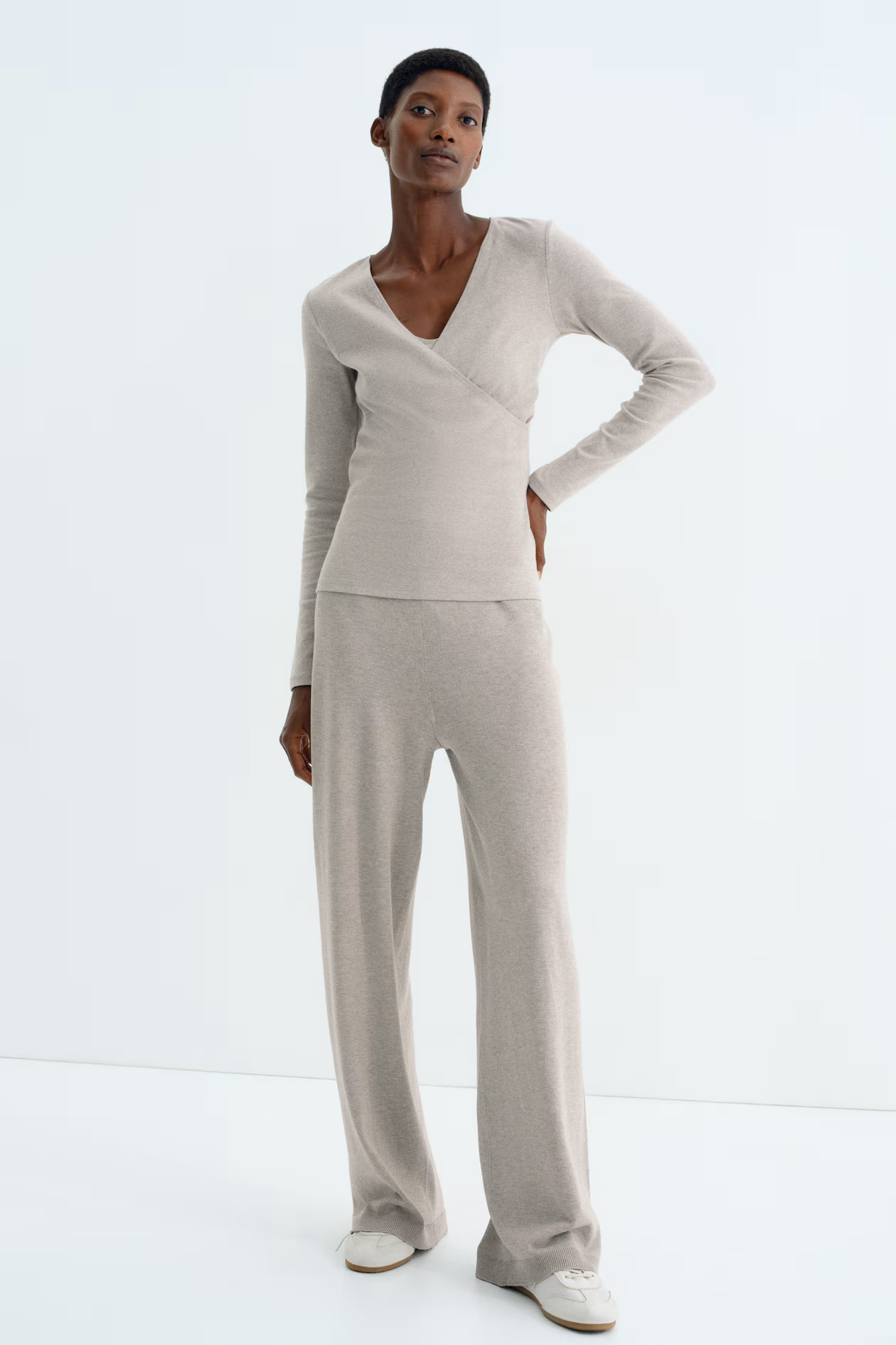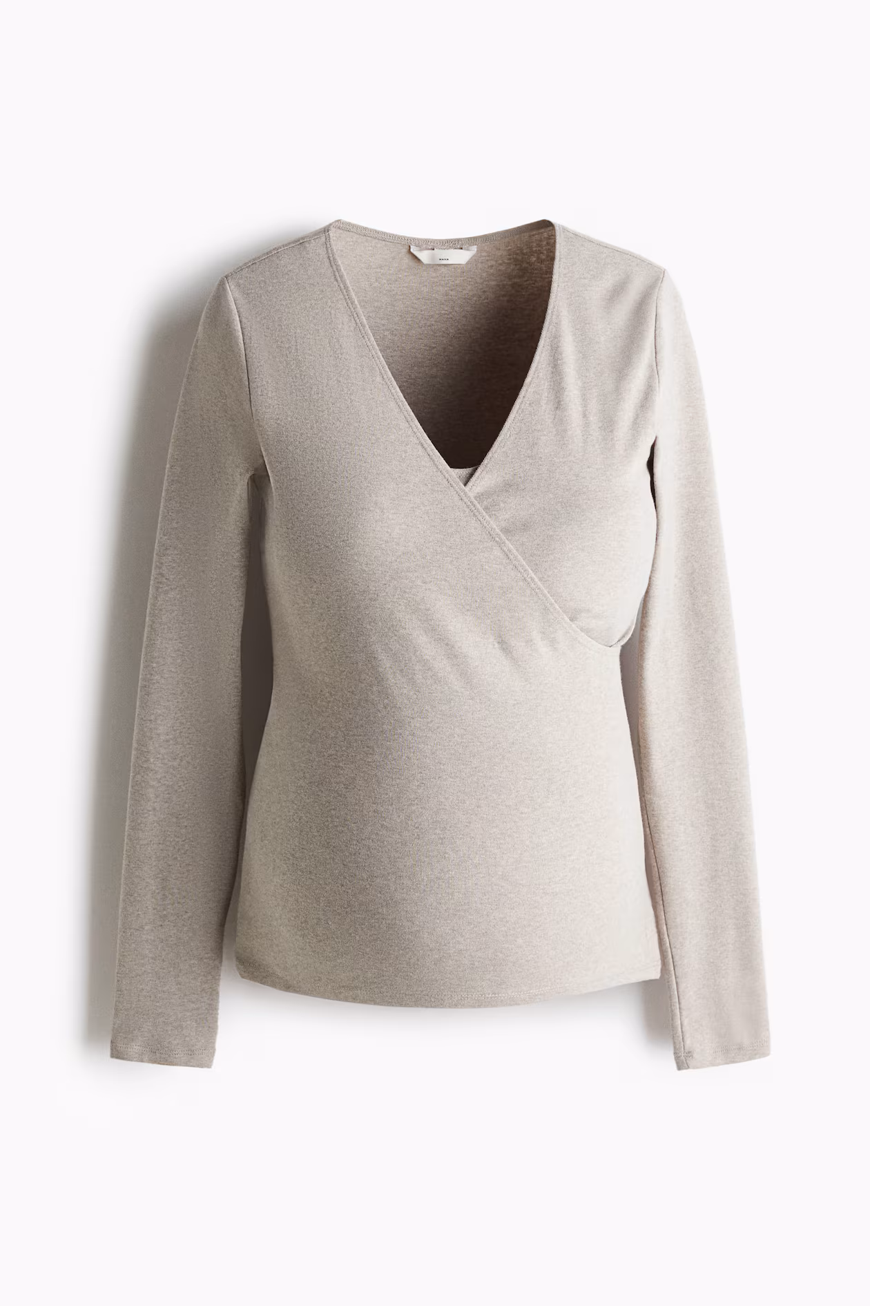 Nursing top in ribbed cotton jersey. V-neck, long sleeves, and wrapover at upper front. Practical inner top for easier nursing access.