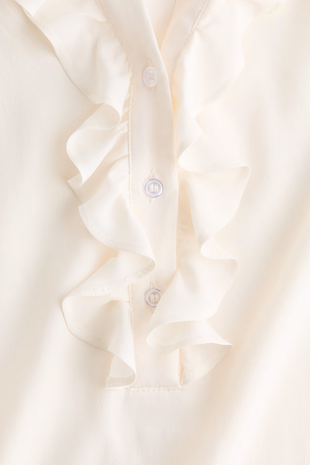 Loose-fit blouse in woven viscose crêpe. Ruffle collar, ruffle-trimmed button placket, and gathered shoulder seams. Long sleeves, gathered cuffs with button, and a rounded hem.