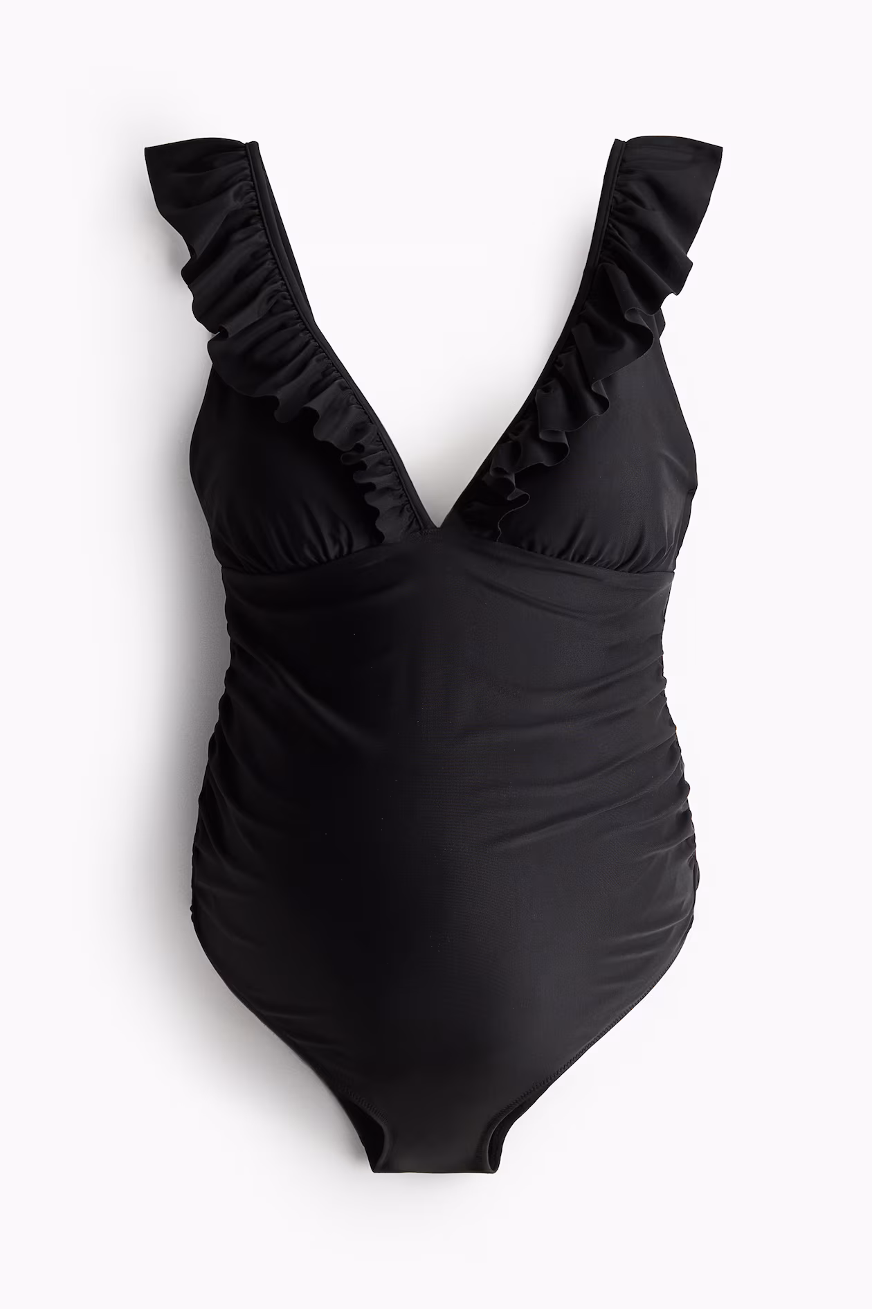 Fully lined swimsuit. Low-cut V-neck with ruffle trim extending over shoulders, cups with removable inserts for shaping and good support, and gathers below bust and in sides for best fit. Medium coverage at back.