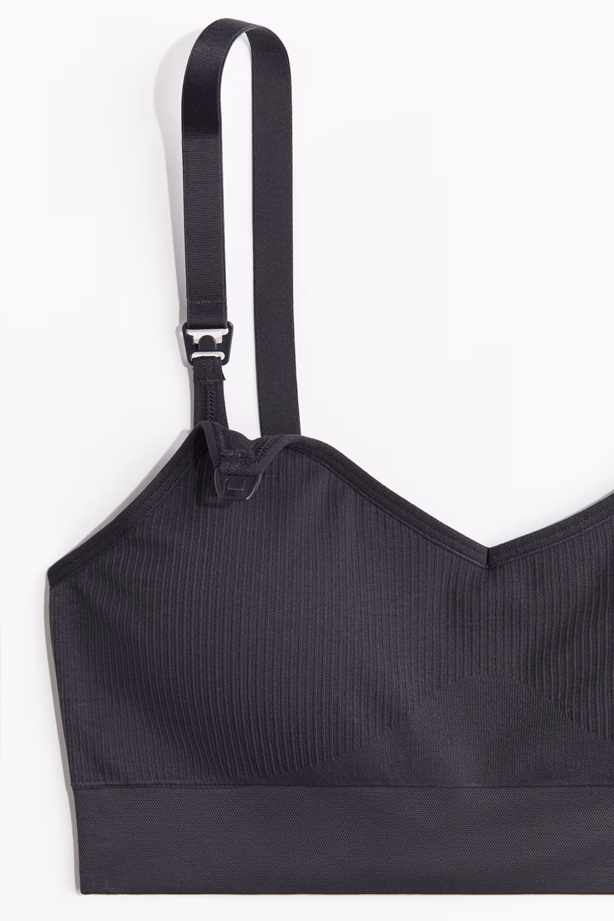 Nursing sports bra in ribbed, fast-drying functional fabric. Adjustable shoulder straps, lined cups with removable inserts and opening with space for nursing pads, and wide elastic at lower edge. Hook-and-eye fasteners at back. Designed with a minimum number of seams for seamless comfort on skin.