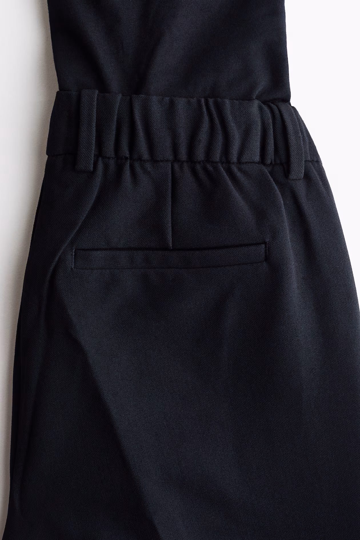 Slim-fit pants in twill with creases at front and back. Wide waistband panel in jersey for best fit, covered elastic at back of waistband, and a mock fly. Diagonal side pockets, welt back pockets, and extra-long legs with a slit at hems.