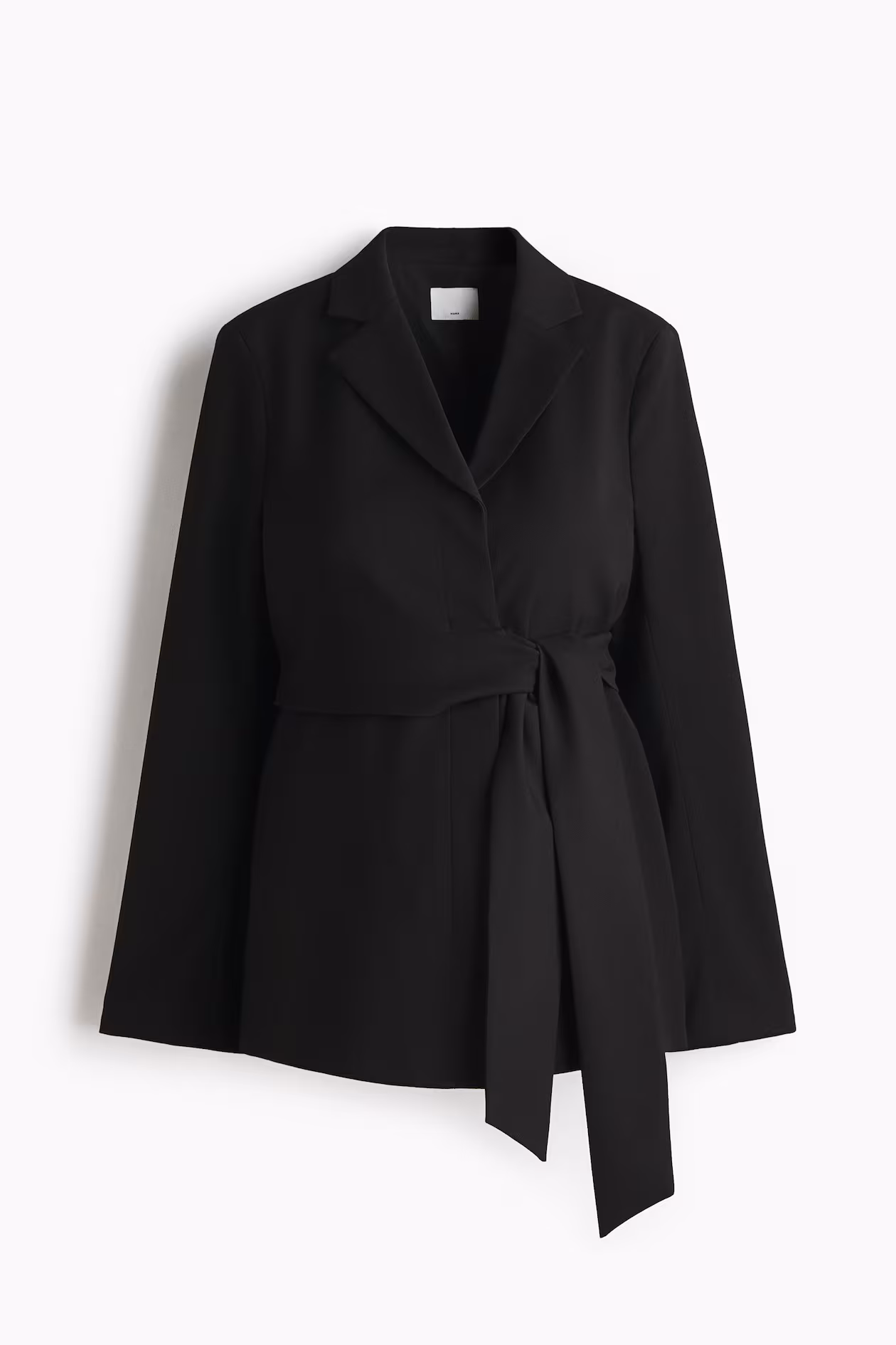 Blazer-style blouse in woven fabric with wide ties at one side. Notched lapels, V-neck, and concealed buttons at front. Shoulder pads and long sleeves. Lined.
