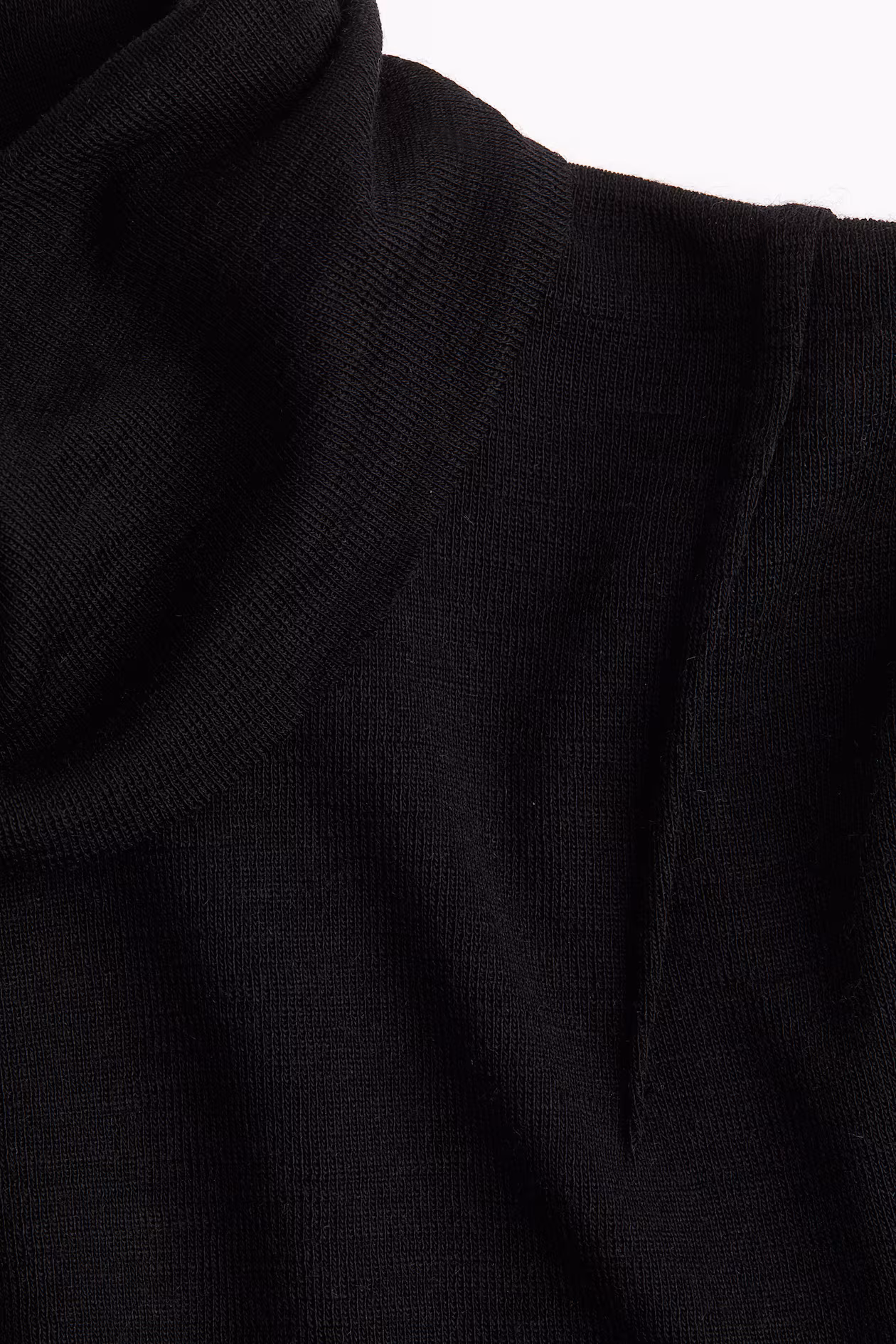 Fitted turtleneck top in sheer, fine-knit merino wool with visible darts at shoulders for subtle structure. Extra-long, close-fitting sleeves, and raw edges at neck, cuffs, and hem. A refined essential to wear on repeat.