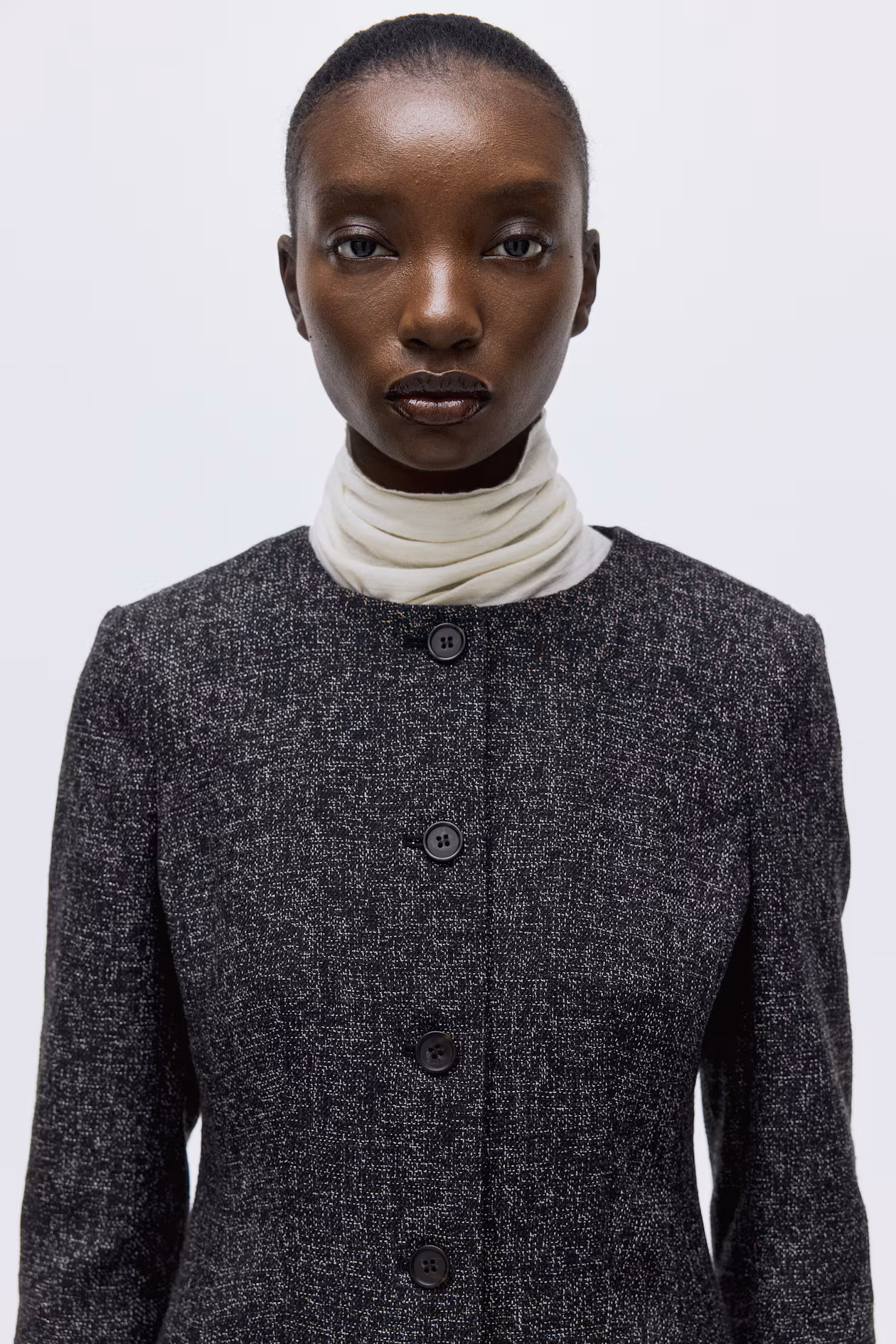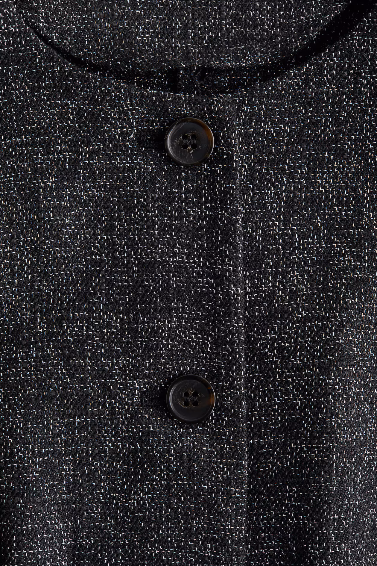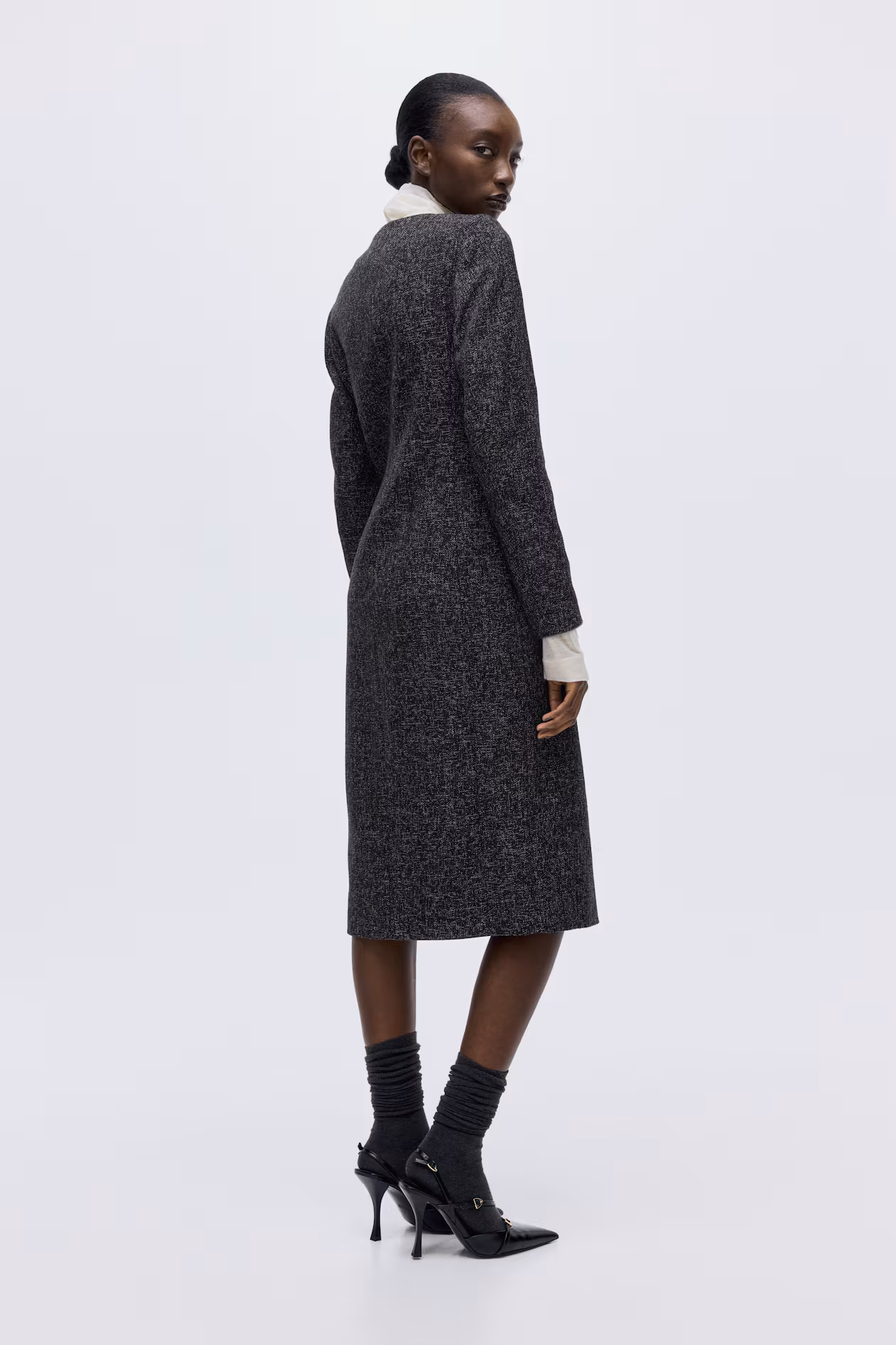 Fitted, calf-length jacket dress in woven fabric. Round neckline, buttons at front, and welt front pockets. Lightweight shoulder pads and long sleeves. Unlined.