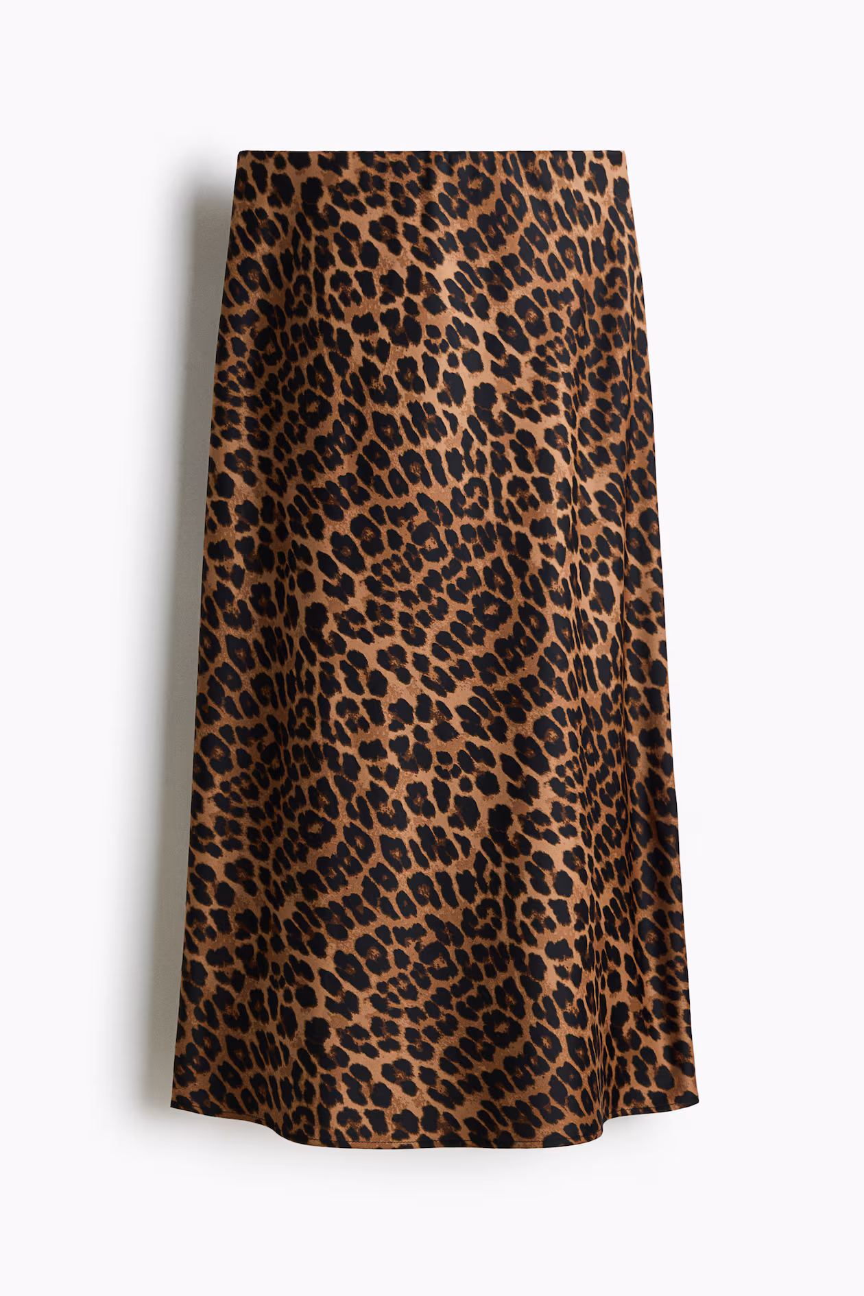 Calf-length skirt in softly draped, woven fabric with a slight sheen. High waist, concealed, elasticized waistband, and gently flared hem. Unlined.