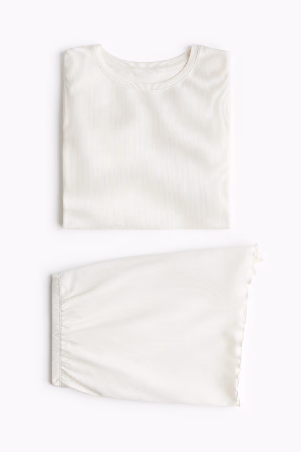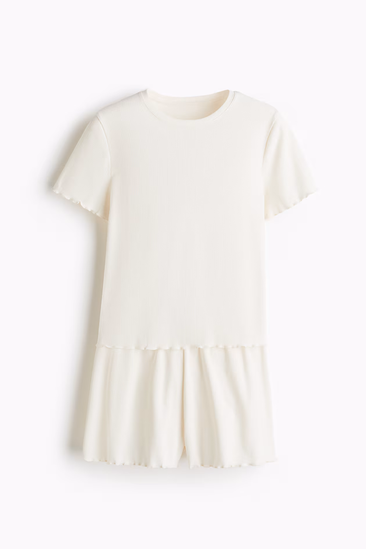 Pajamas in a soft modal and cotton blend with a T-shirt and shorts. T-shirt with a round neckline and overlocked edges at cuffs and hem. Shorts with covered elastic at waistband and overlocked hems.