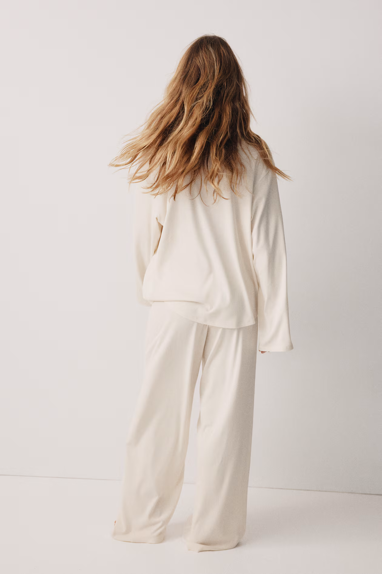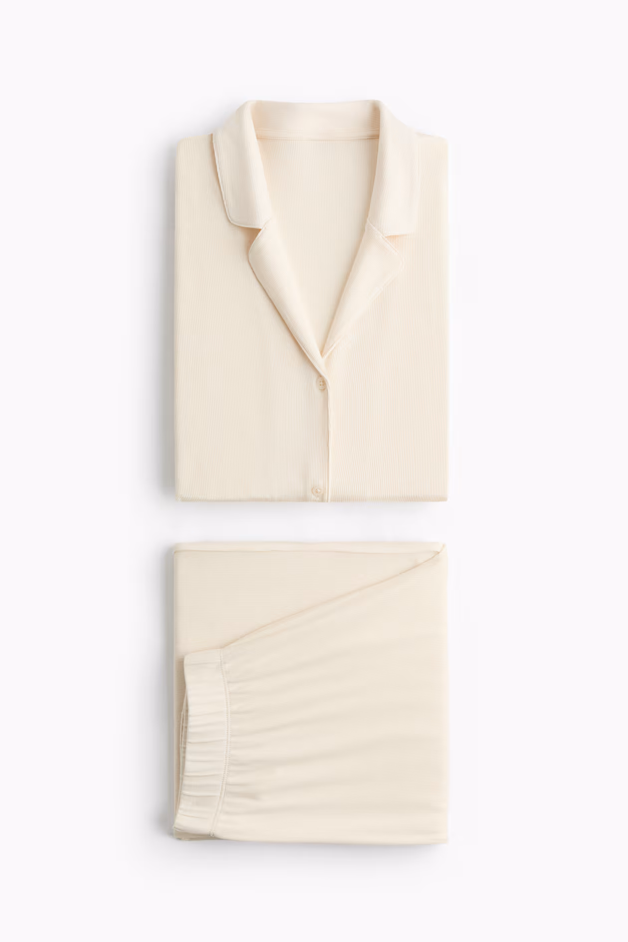 Pajamas in soft ribbed jersey made from a modal and cotton blend with a shirt and pants. Shirt with a resort collar, buttons at front, dropped shoulders, and long sleeves. Pants with covered elastic at waistband.