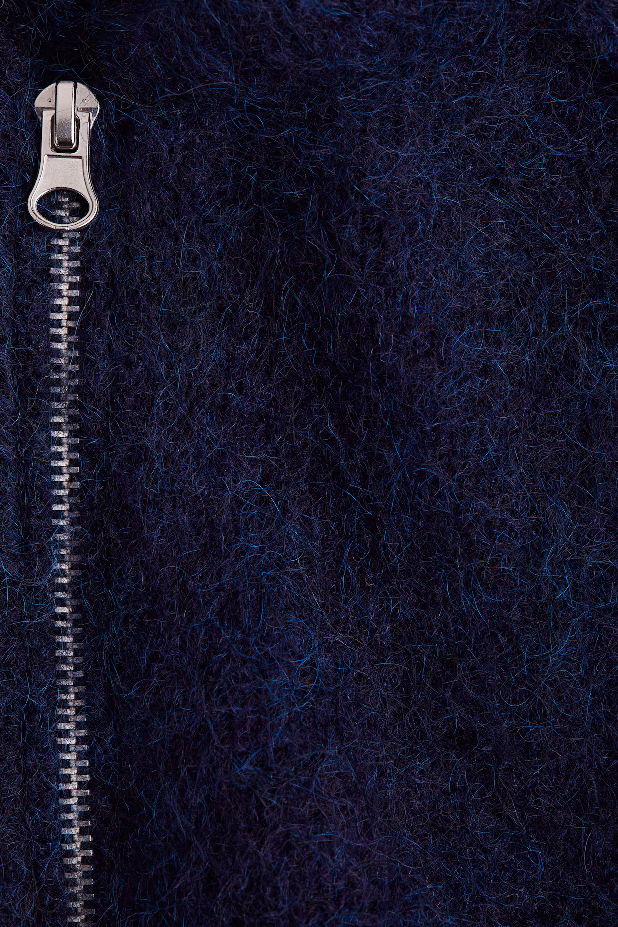 Short, loose-fit cardigan in a soft knit with mohair and wool content. Stand-up collar, two-way zipper at front, and dropped shoulders with linked seams at front and back for a saddle-shoulder look. Ribbing at collar, cuffs, and hem.
