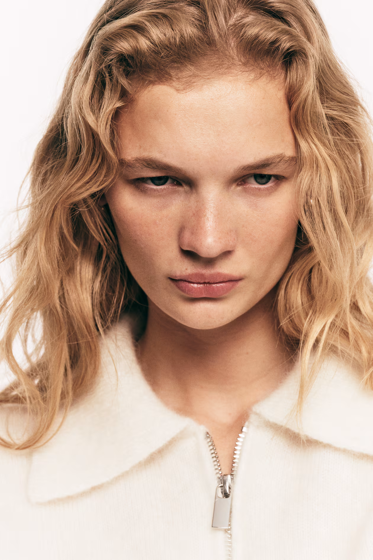 Loose-fit sweater in a soft knit with mohair and wool content. Collar, half-zip, and dropped shoulders. Ribbing at cuffs and hem.