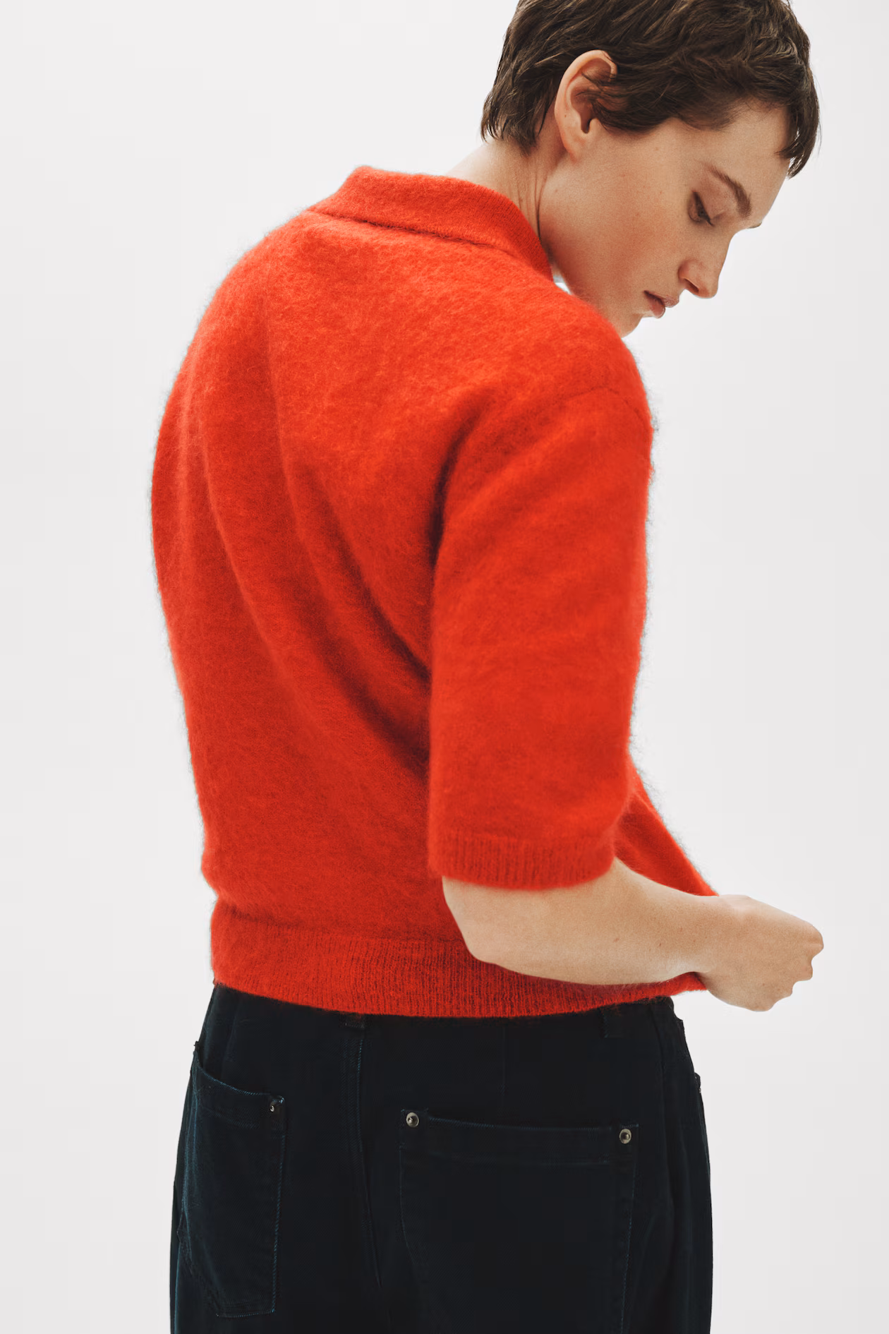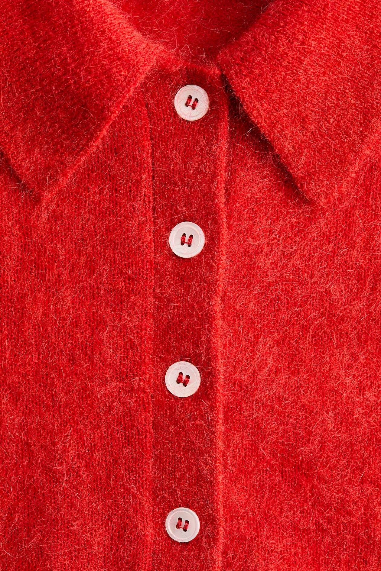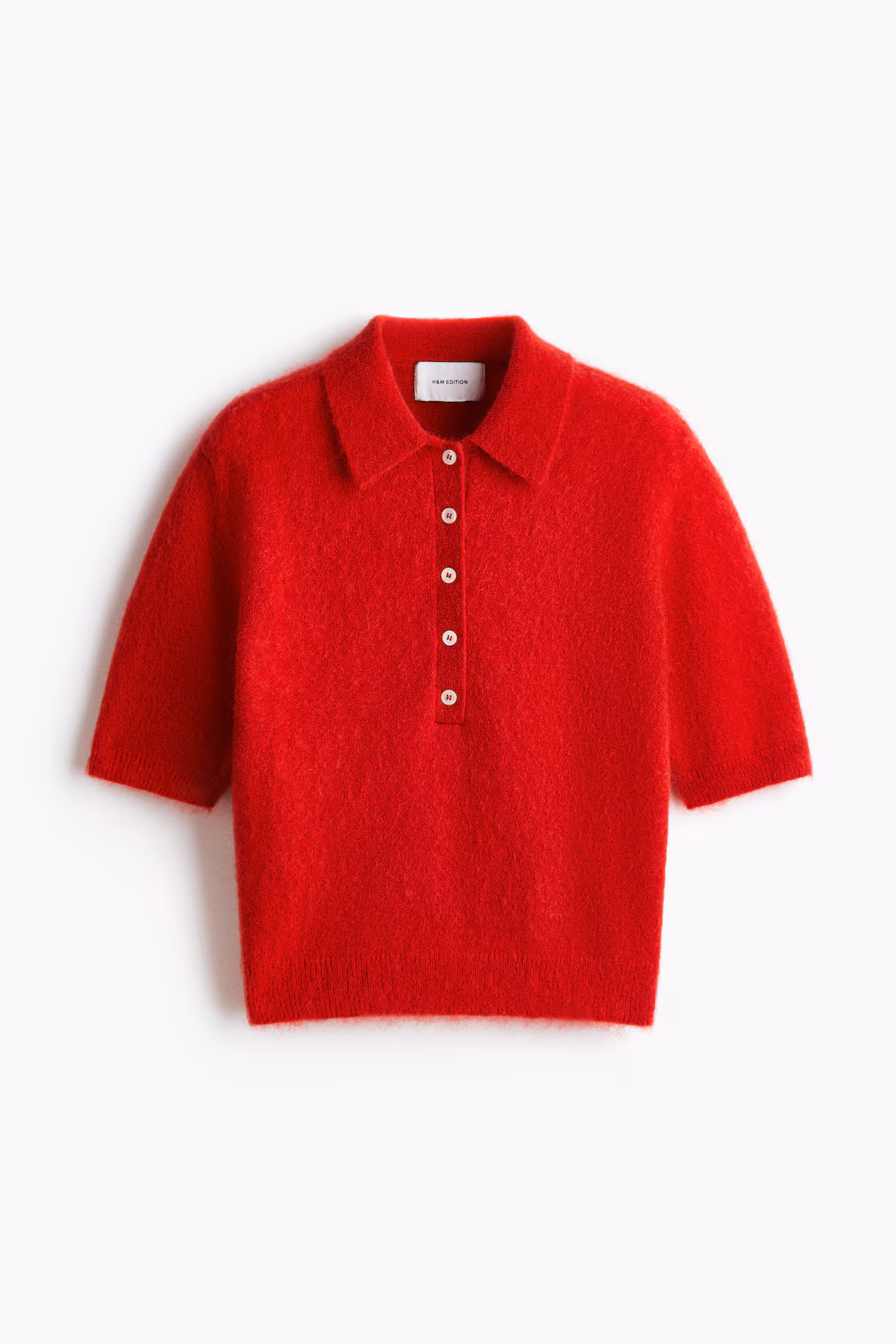 Short polo shirt in a soft knit with mohair and wool content. Collar, short button placket, and short sleeves. Ribbing at cuffs and hem.