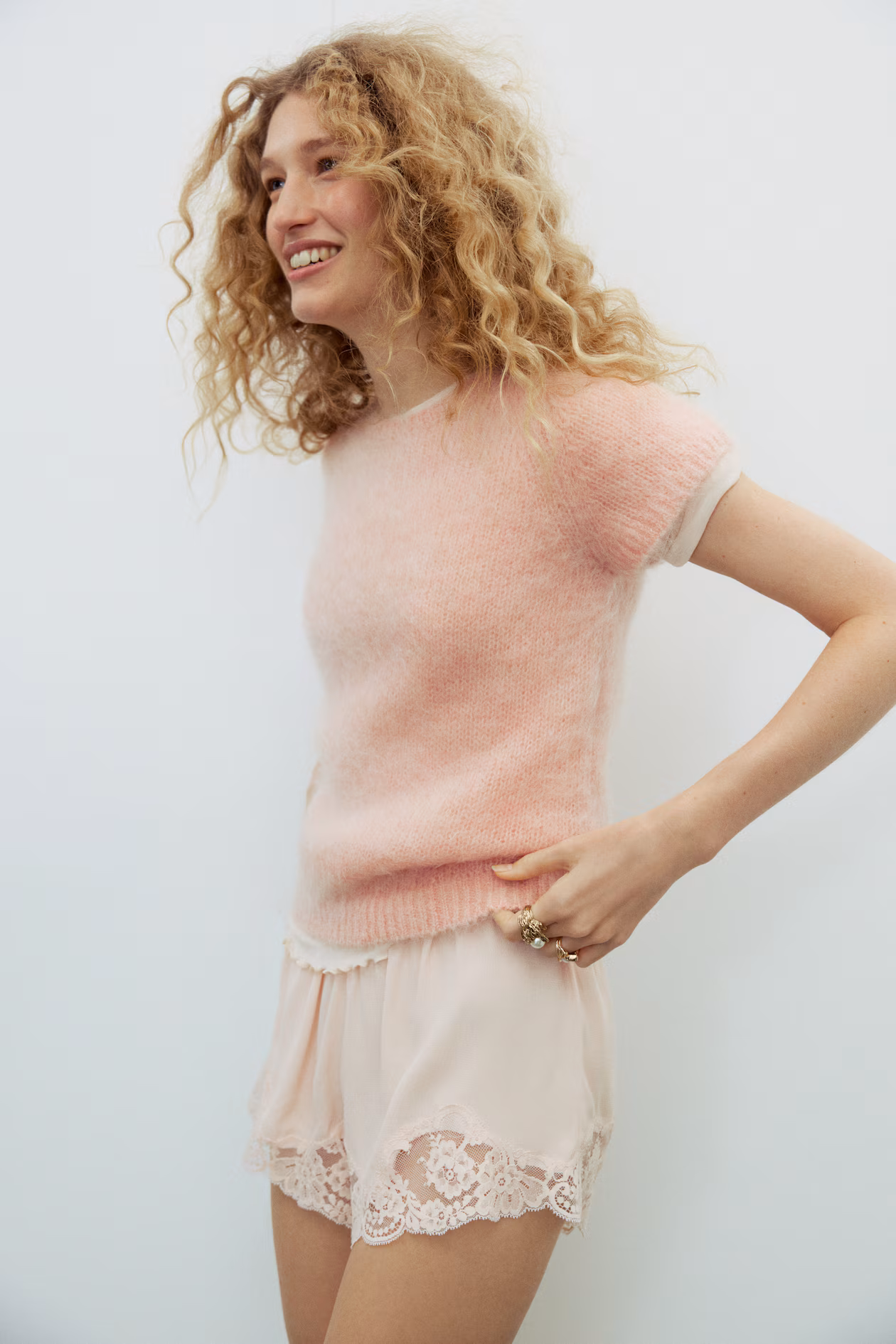 Short, fitted top in a soft, gently brushed knit with mohair and wool content. Crew neck, short raglan sleeves, and a straight hem. Ribbing at neck, cuffs, and hem.