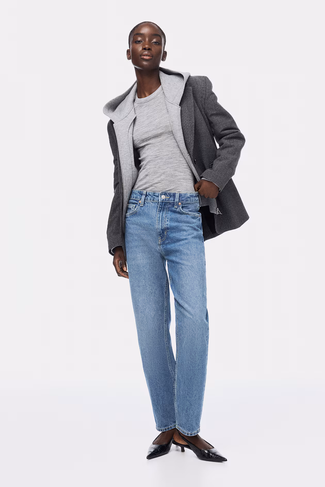 5-pocket jeans in denim with gentle stretch for good comfort. Slim fit from hip to thigh. High waist, zip fly with button, and ankle-length straight legs, tapered at hem.