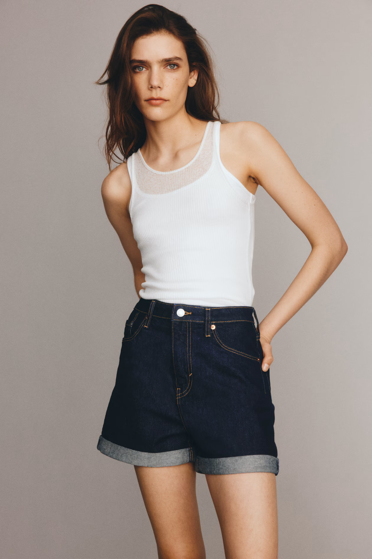 5-pocket shorts in cotton denim with gentle stretch for added freedom of movement. Extra-high waist, zip fly with button, and sewn foldover cuffs.