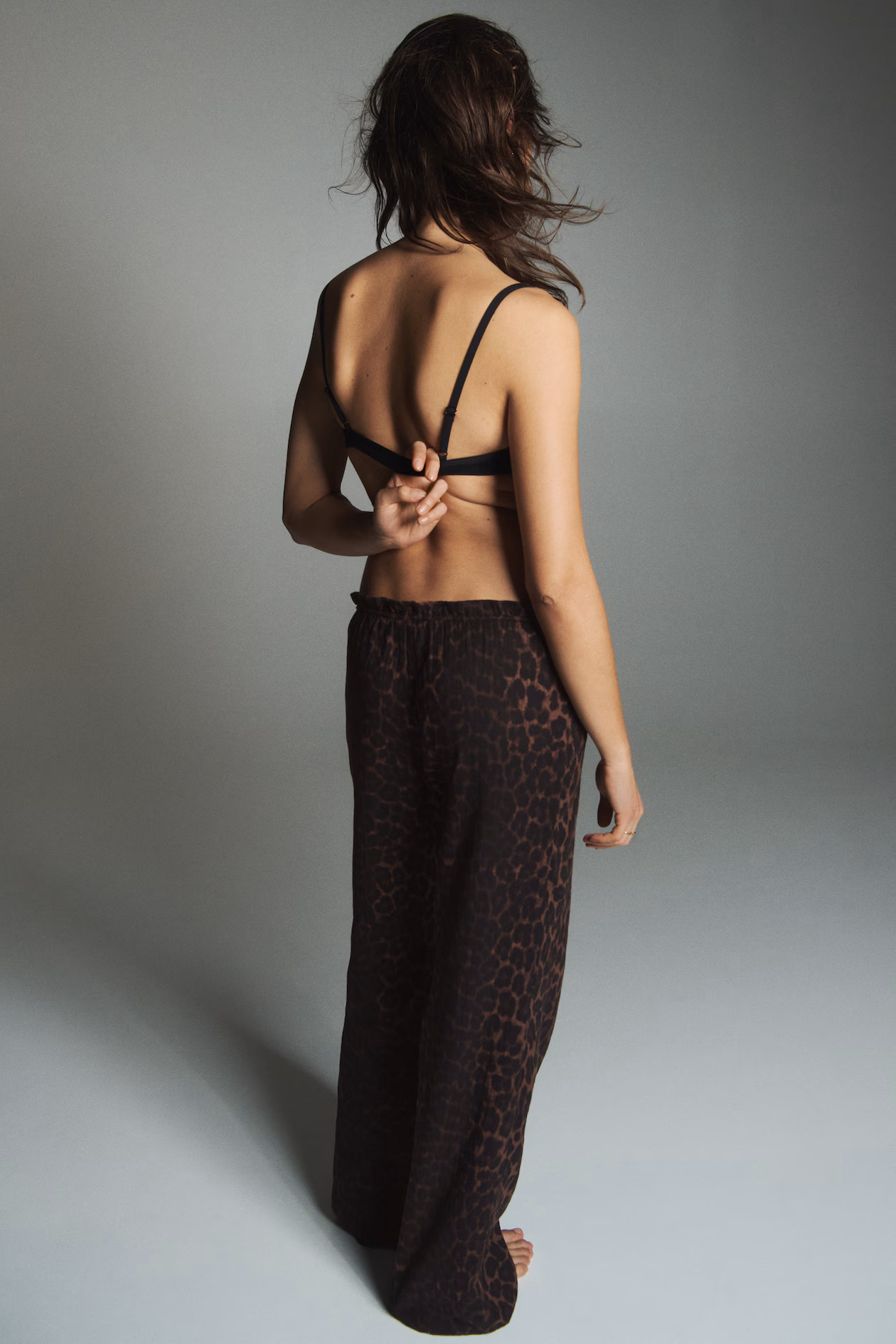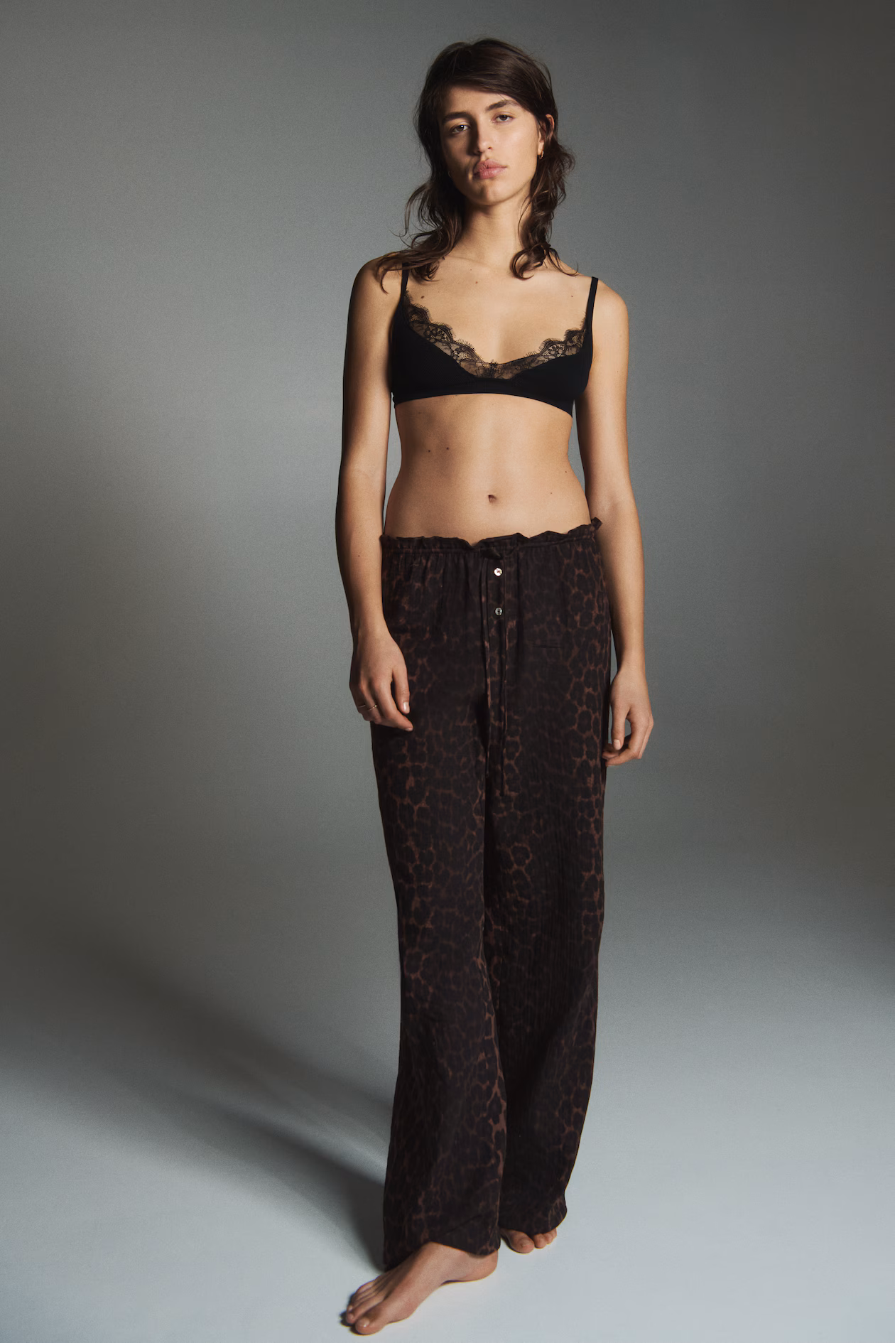 Loose-fit pajama pants in soft cotton muslin. Ruffle-trimmed elasticized waistband with an extra-narrow drawstring and mock fly with buttons. Straight legs.